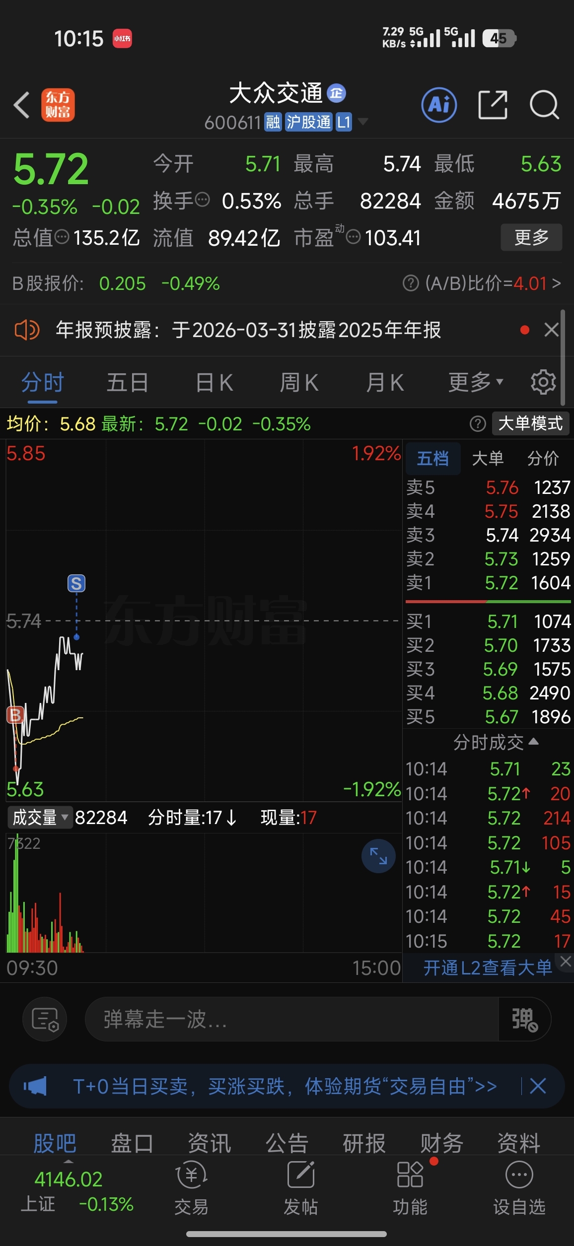 $大众交通(SH600611)$ 本来已经收手不做t了的,六块买你被套,感觉不做t回不了本,今天t一个点吧