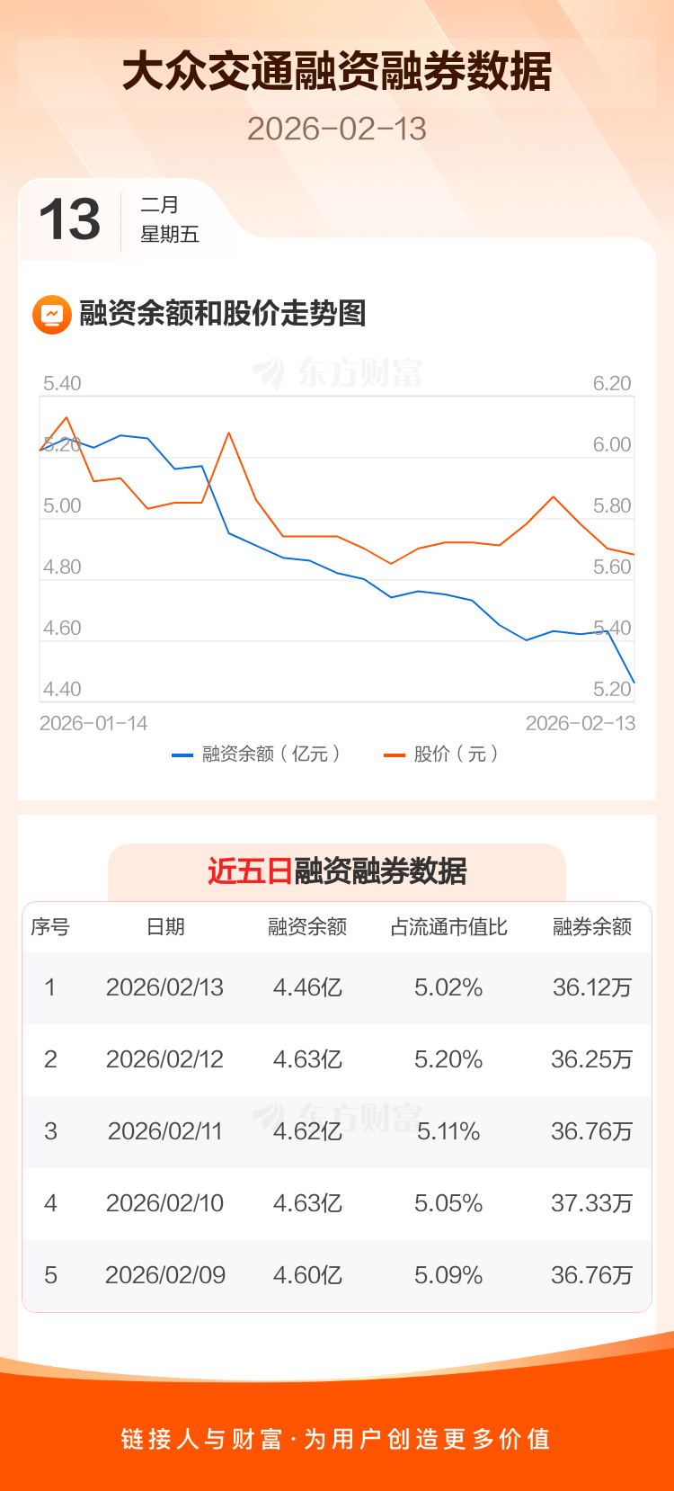 交易所最新数据显示,大众交通于2026年2月13日获融资买入1442.11万元,融资偿还3191.75万元,当日融资净偿还1749.64万元。目前,该股融资余额4.46亿,占流通市值比例为5.02%。