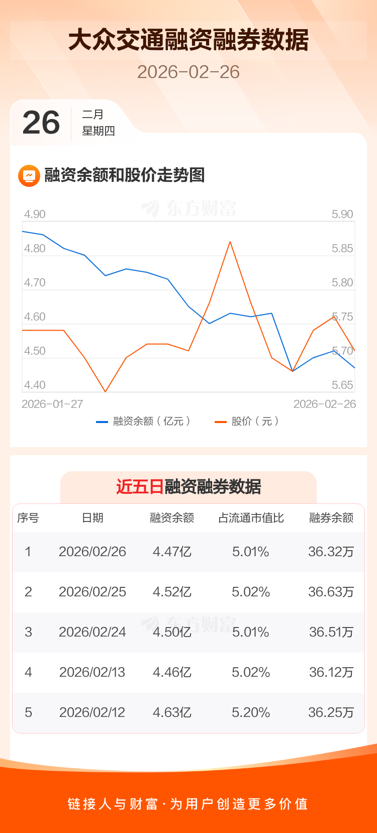 交易所最新数据显示,大众交通于2026年2月26日获融资买入978.37万元,融资偿还1434.04万元,当日融资净偿还455.67万元。目前,该股融资余额4.47亿,占流通市值比例为5.01%。