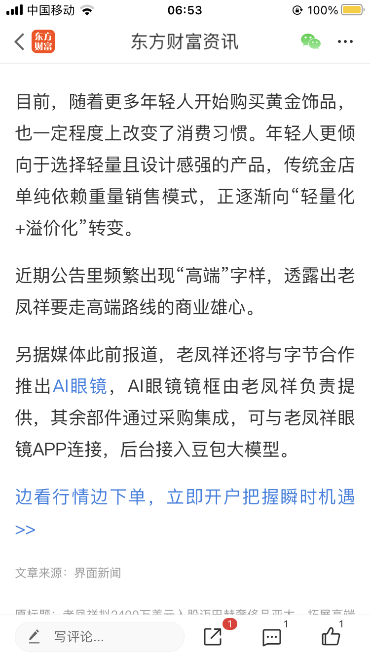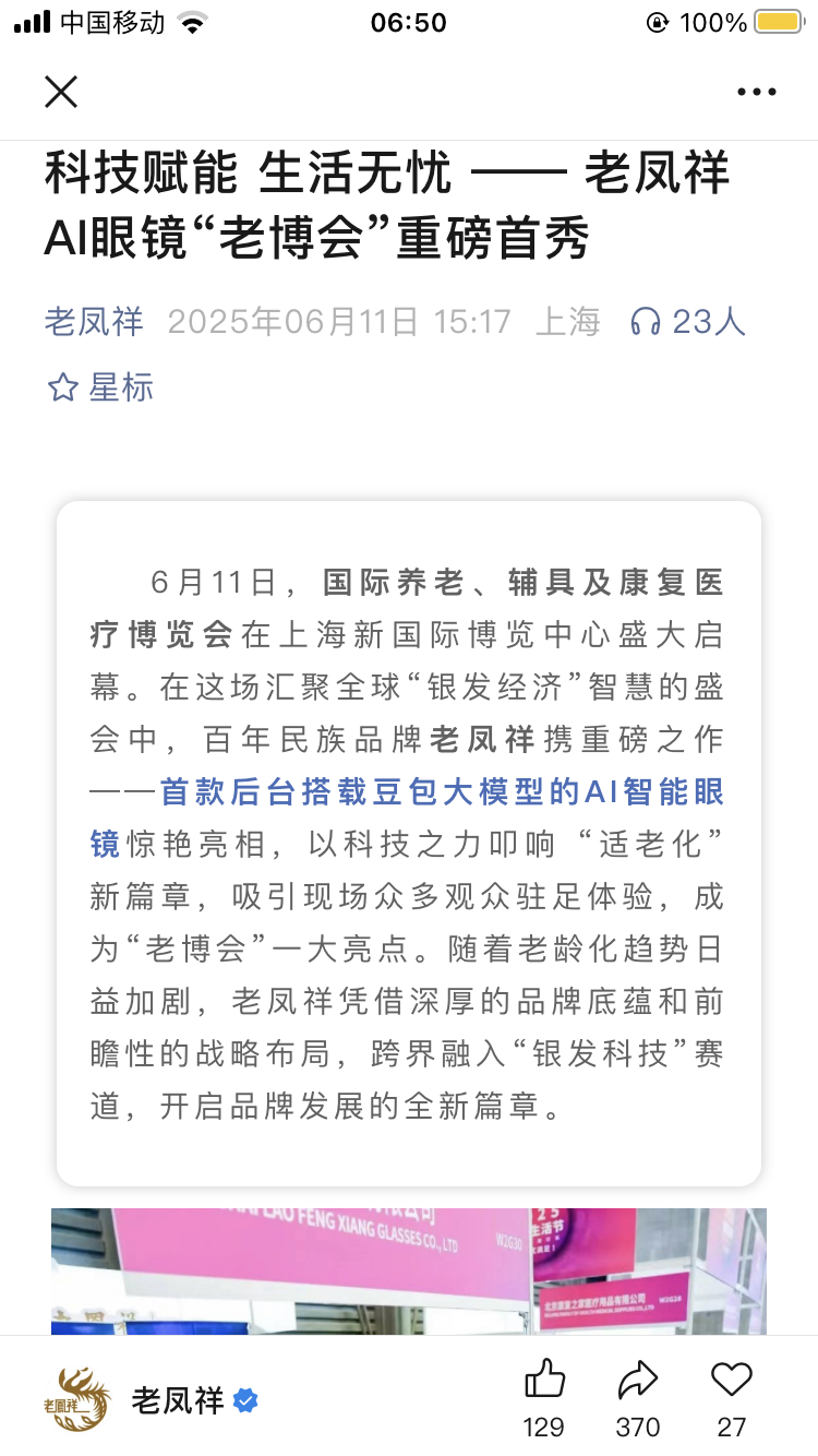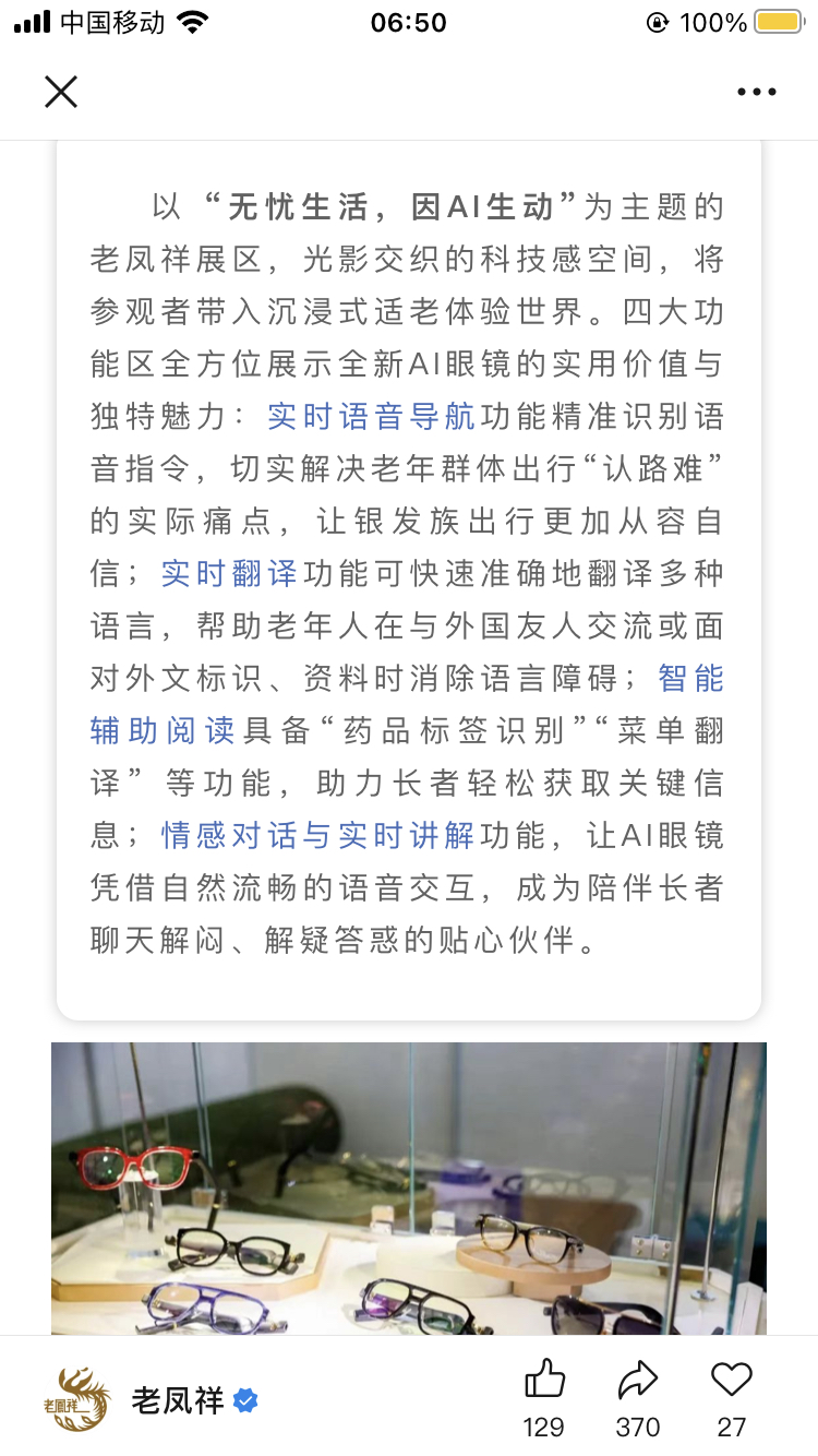 未来AI+新消费模式崛起,老凤祥AI眼镜+字节跳动+迈巴赫高端品牌系列合作。老凤