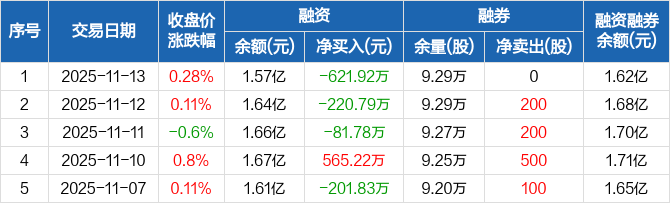 融资方面,当日融资买入727.31万元,融资偿还1349.24万元,融资净偿还621.92万元,连续3日净偿还累计924.49万元。融券方面,融券卖出0股,融券偿还0股,融券余量9.29万股,融券余额431.99万元。融资融券余额合计1.62亿元。