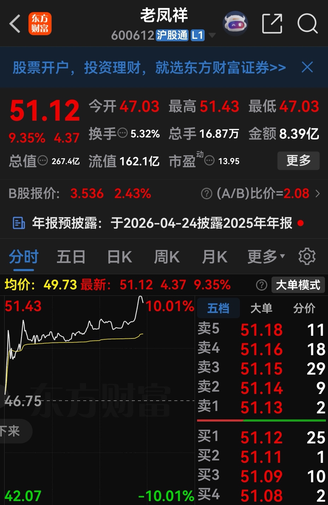 以50.88挂单卖出老风祥,这个居然会摸上停板,虽然只是昙花一现,必竟也有一个曾