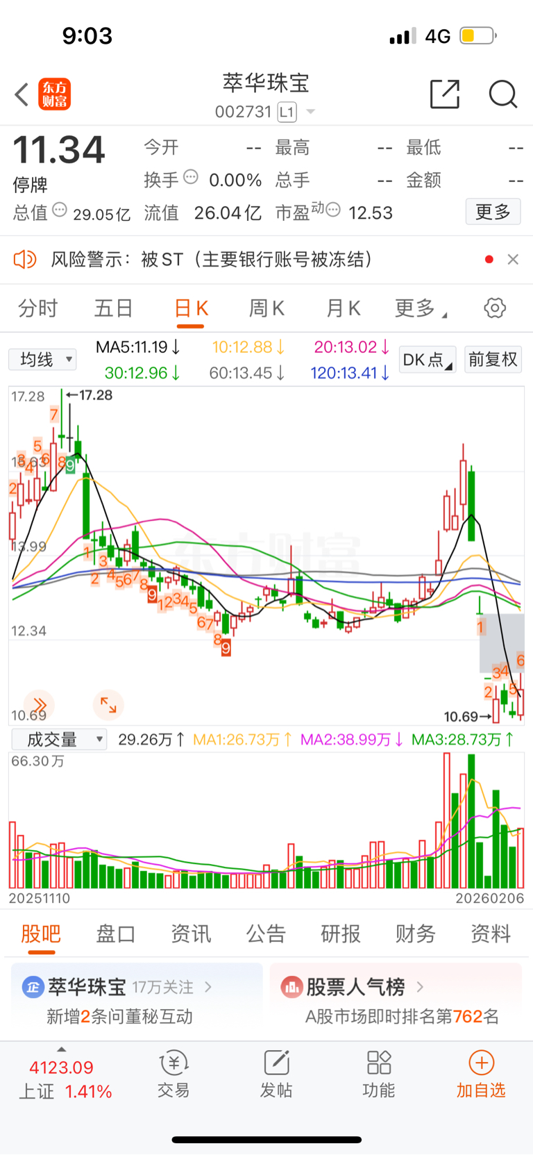 $老凤祥(SH600612)$ 竟然和S T萃华走势一摸一样,难道你也要ST了吗,有点不忍直视
