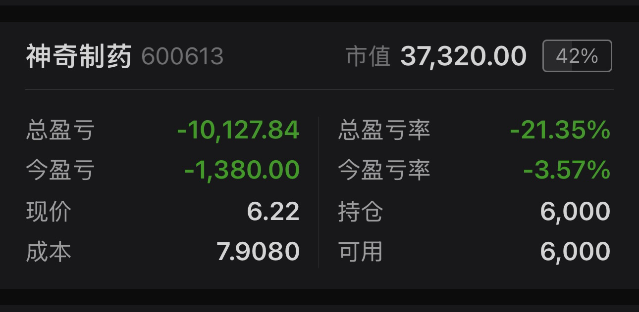 $神奇制药(SH600613)$ 我想问问还有谁,本来我的成本7.60,回本那天我挂单卖出点成了买入,从此再没有回到7.60…留了四万多,这垃圾越来越跌狠了啊