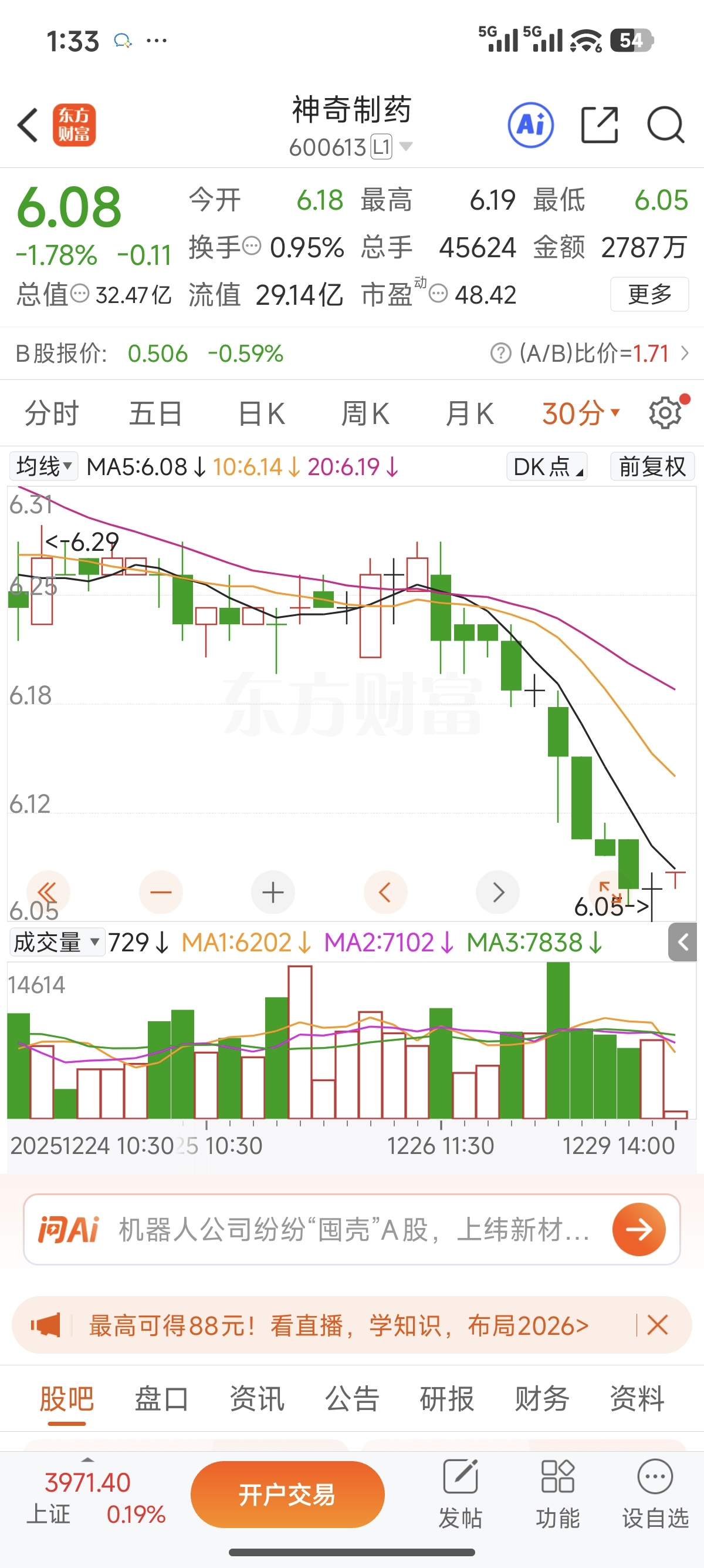$神奇制药(SH600613)$ 30分钟线有个向上跳空,所以现在不是底部