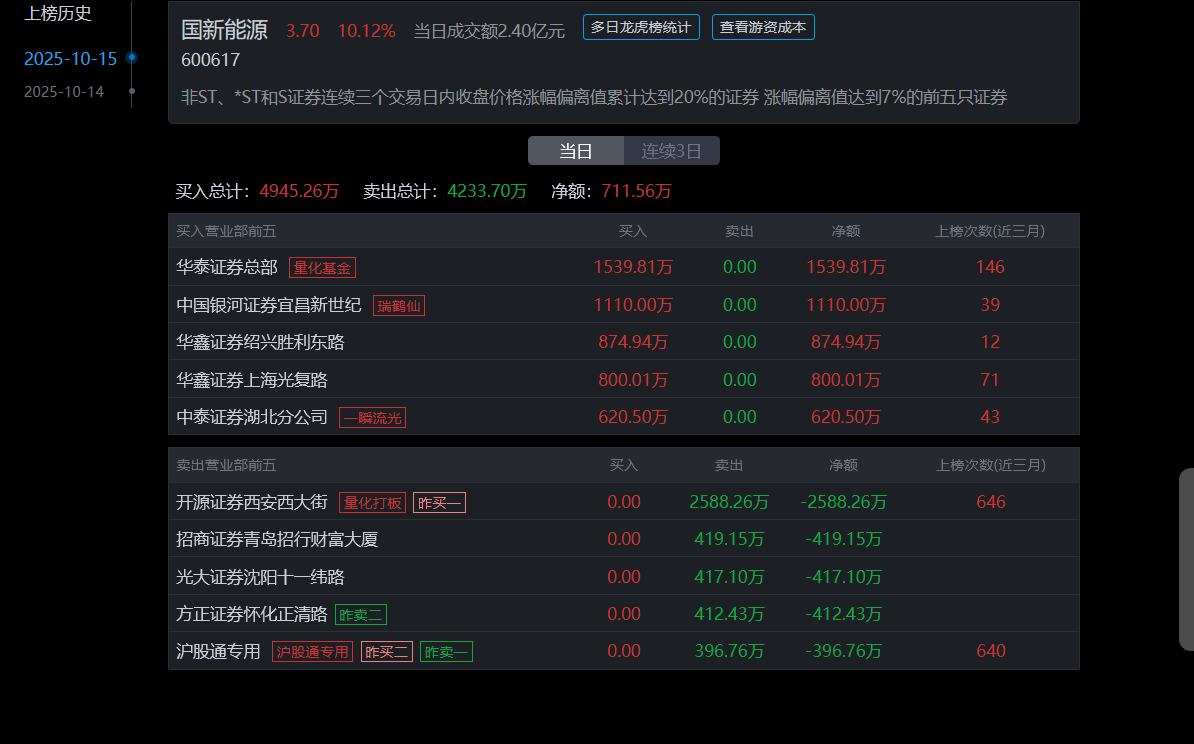国新能源今日游资龙虎榜席位上榜数据如下!