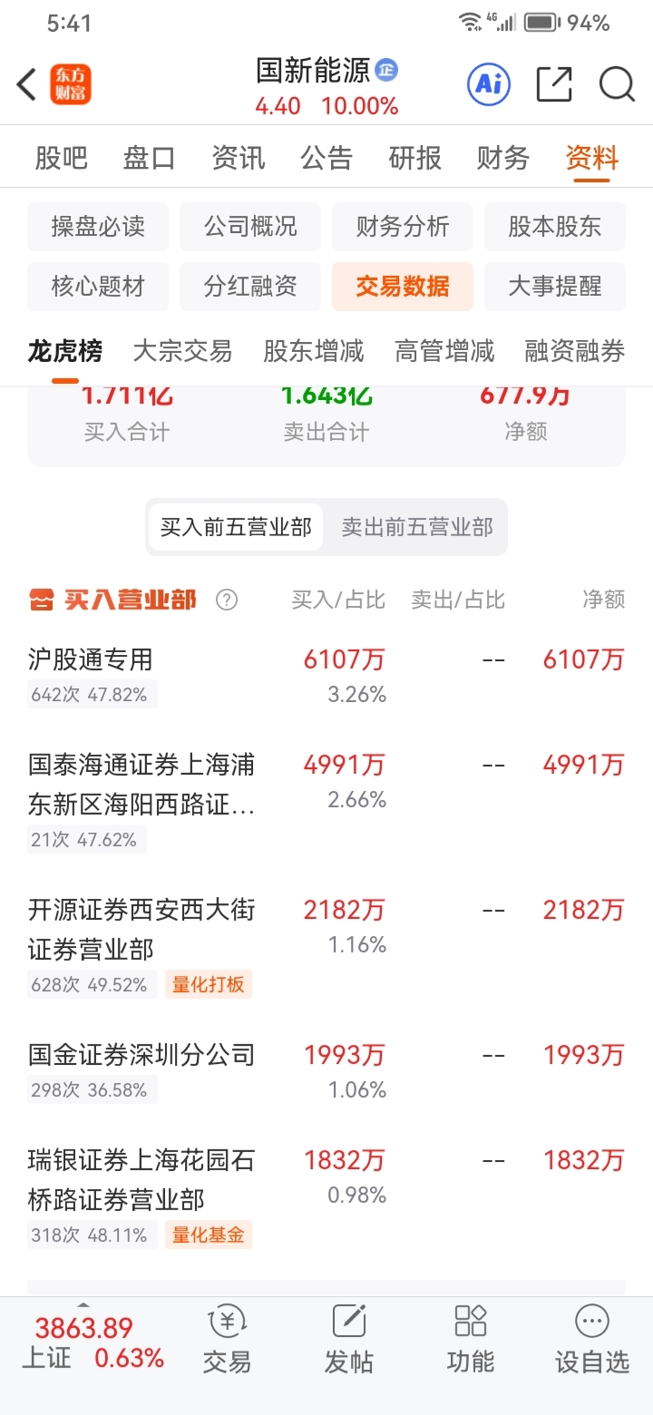 $国新能源(SH600617)$ 请教一下龙虎榜买的数字下面百分比是代表挣的钱还是买的位置?拜谢