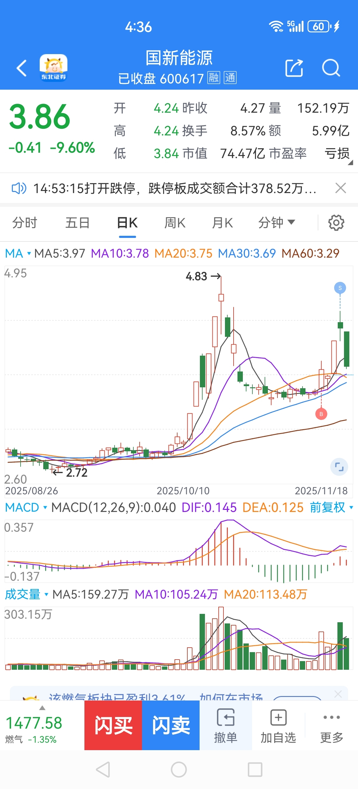 $国新能源(SH600617)$ 燃气板块今天都倒下,国新能源缩量跌停,明天继续缩量下跌小阴或者小阳,形成三阴洗盘,考虑低吸。