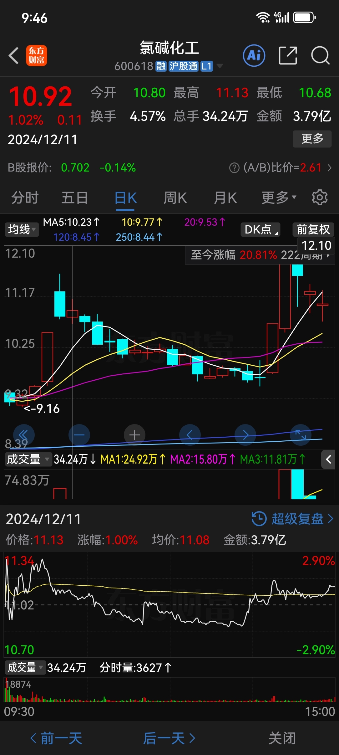 $氯碱化工(SH600618)$ 2024年12月11,涨停后第二天的样子,