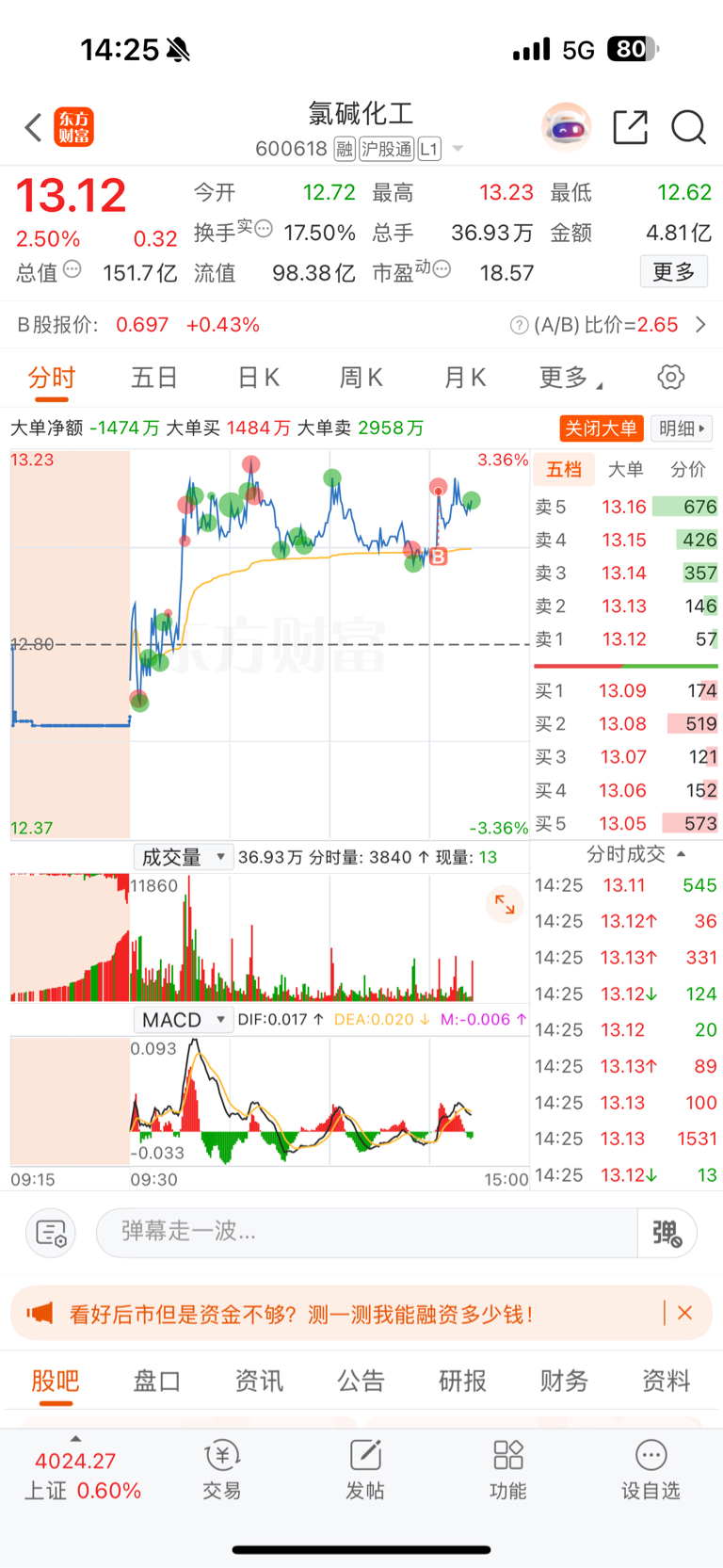$氯碱化工(SH600618)$ 骗炮,本来一个点一直等着进,小单来拉,13.14进的