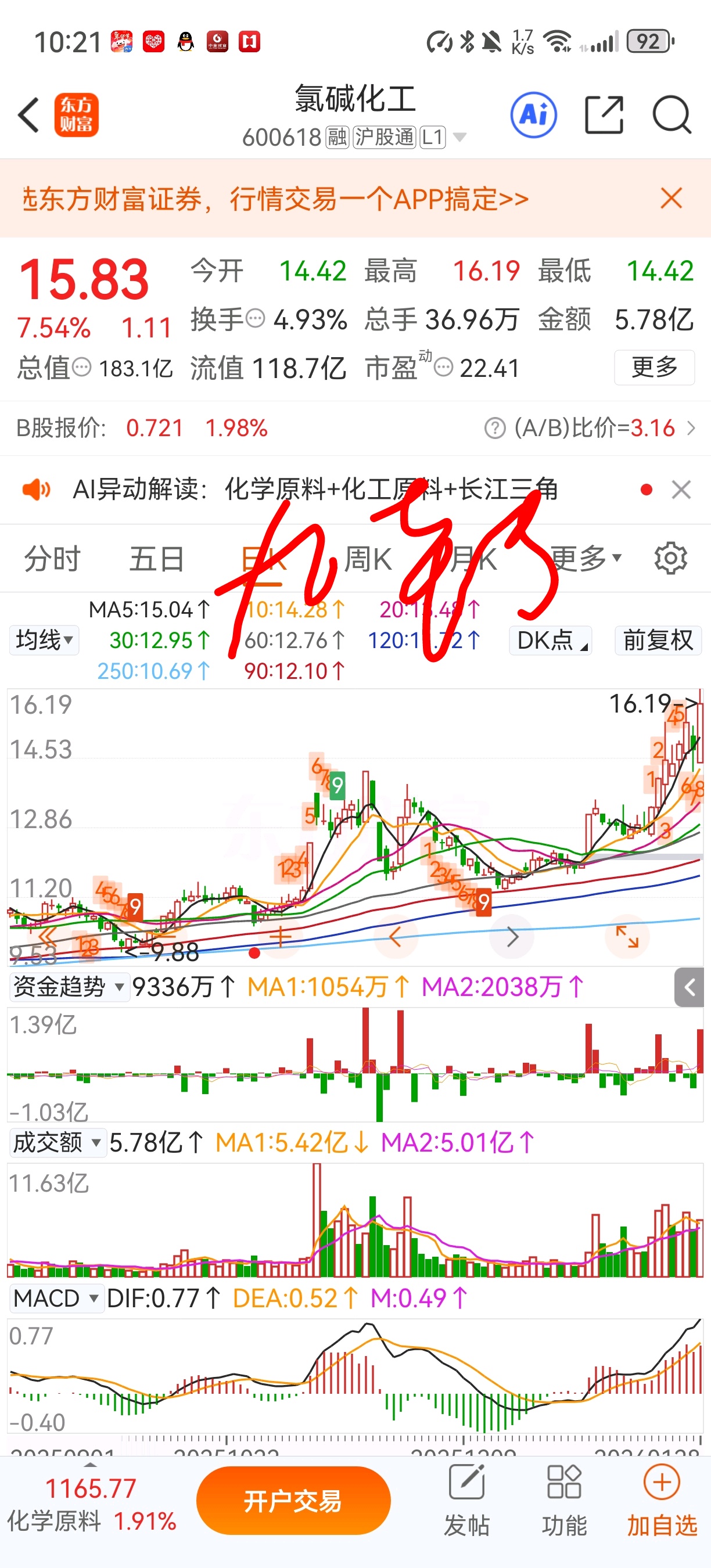 $氯碱化工(SH600618)$ 短期头部形成,调整10天以上吧,幅度就看洗的情况了