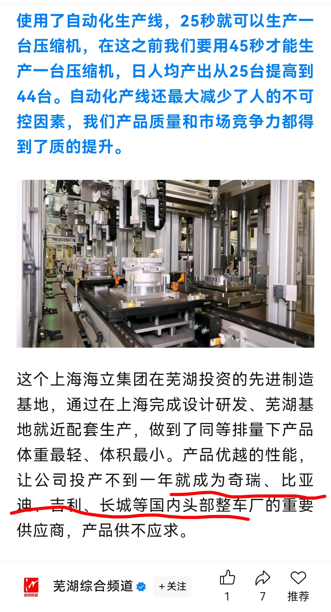 $海立股份(SH600619)$ 已确认海立拿到奇瑞订单。海立芜湖基地订单饱和,生产的新能源汽车电动压缩机供不应求。$奇瑞汽车(HK|09973)$