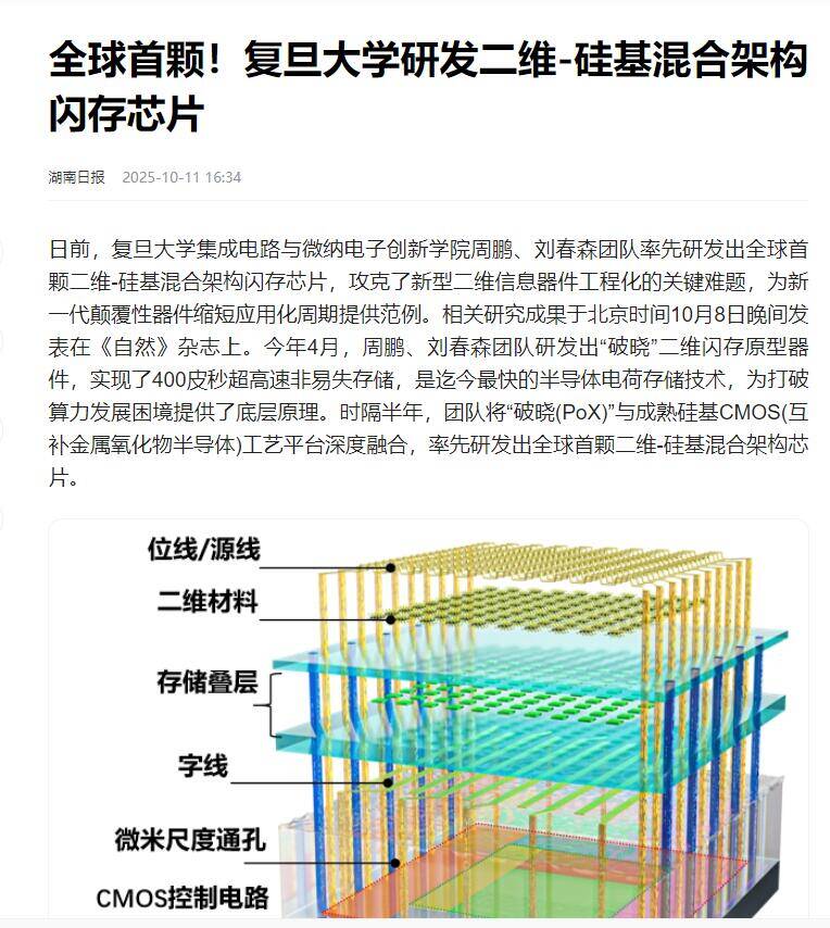 全球首颗!复旦大学研发二维-硅基混合架构闪存芯片!!!