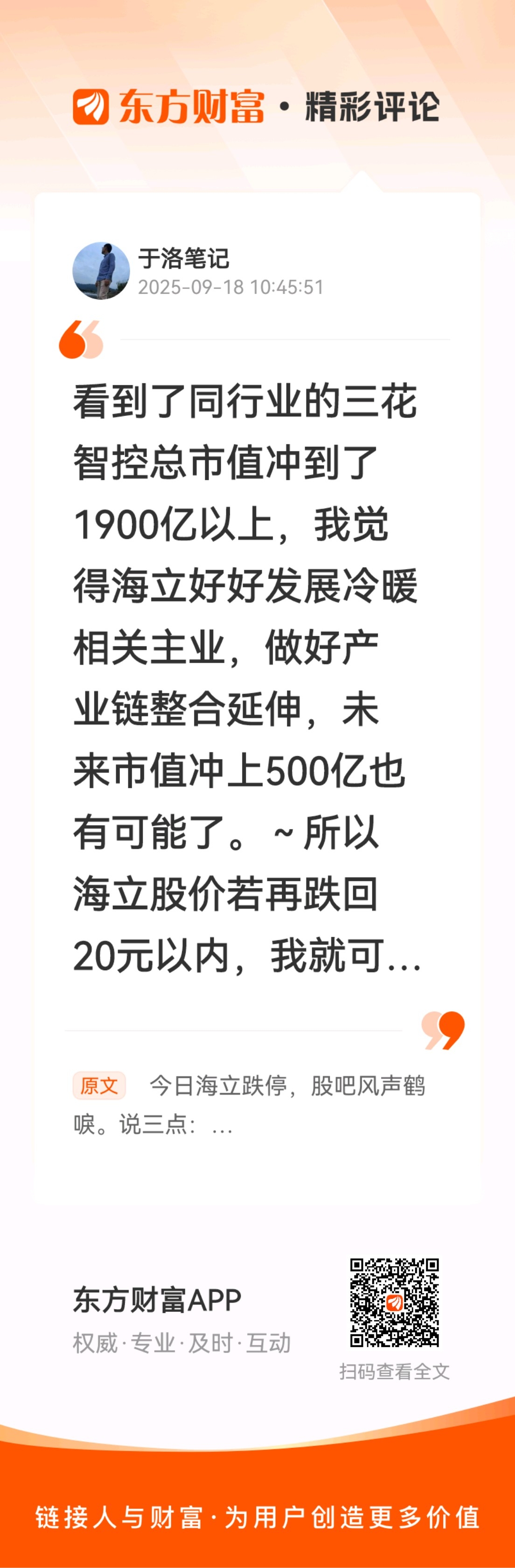 $海立股份(SH600619)$ 三花智控总市值已经冲到了2100亿以上,海立股份目前总市值不到200亿,海立未来还有可能达到500亿市值吗?$三花智控(SZ002050)$