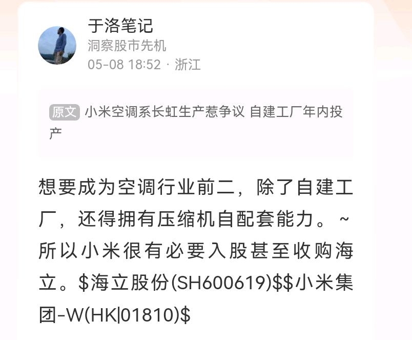 $海立股份(SH600619)$ 随着大股东上海电气总公司和二股东格力电器对海立股份阶段性减持完成,小米或海尔正迎来举牌海立股份的最佳窗口期。$小米集团-W(HK|01810)$ $海尔智家(SH600690)$