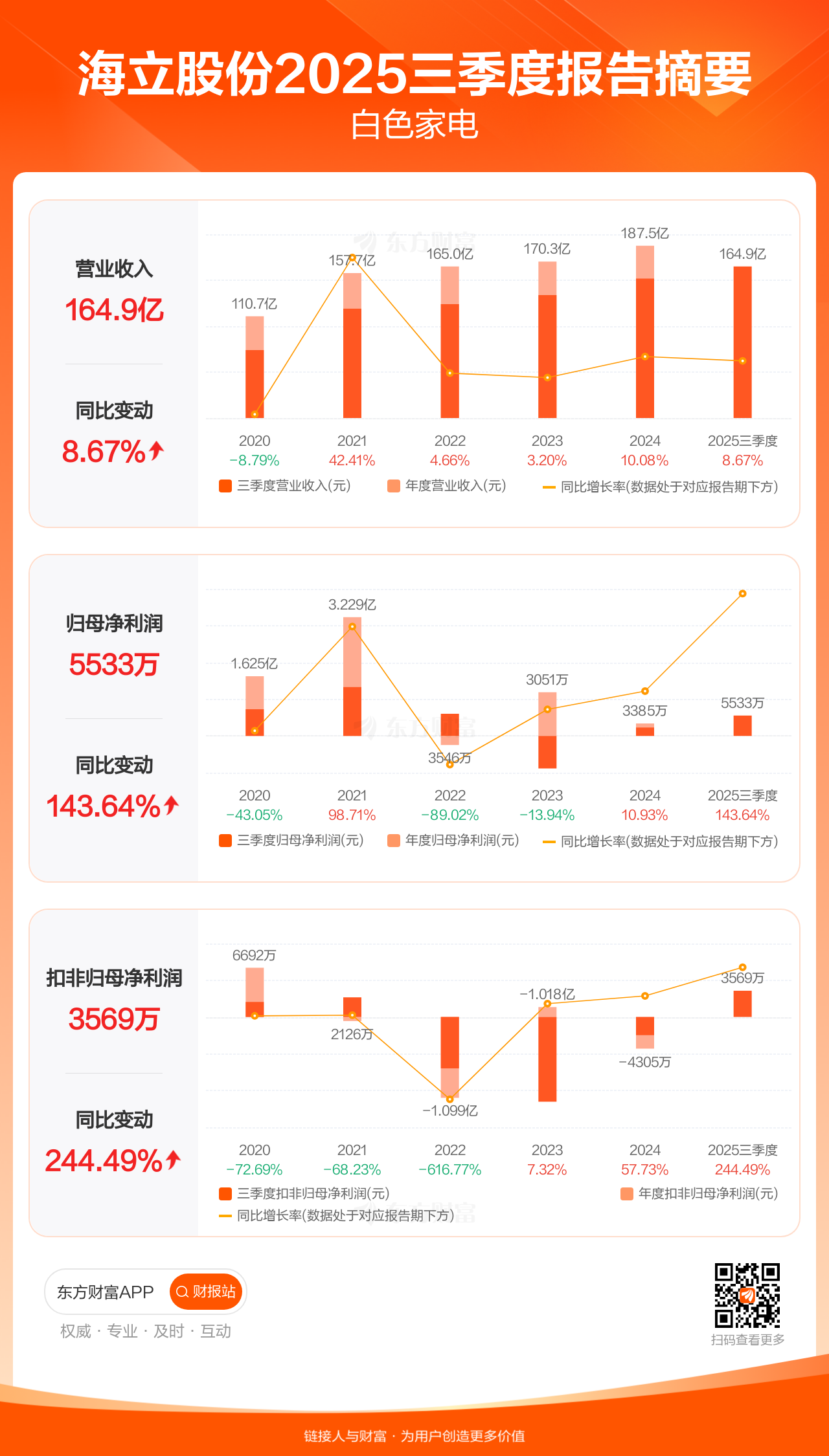 海立股份10月31日发布2025年三季报显示,公司前三季实现营业收入164.89亿元,同比增长8.67%;归母净利润5533.32万元,同比增长143.64%;扣非归母净利润3568.91万元,同比增长244.49%。