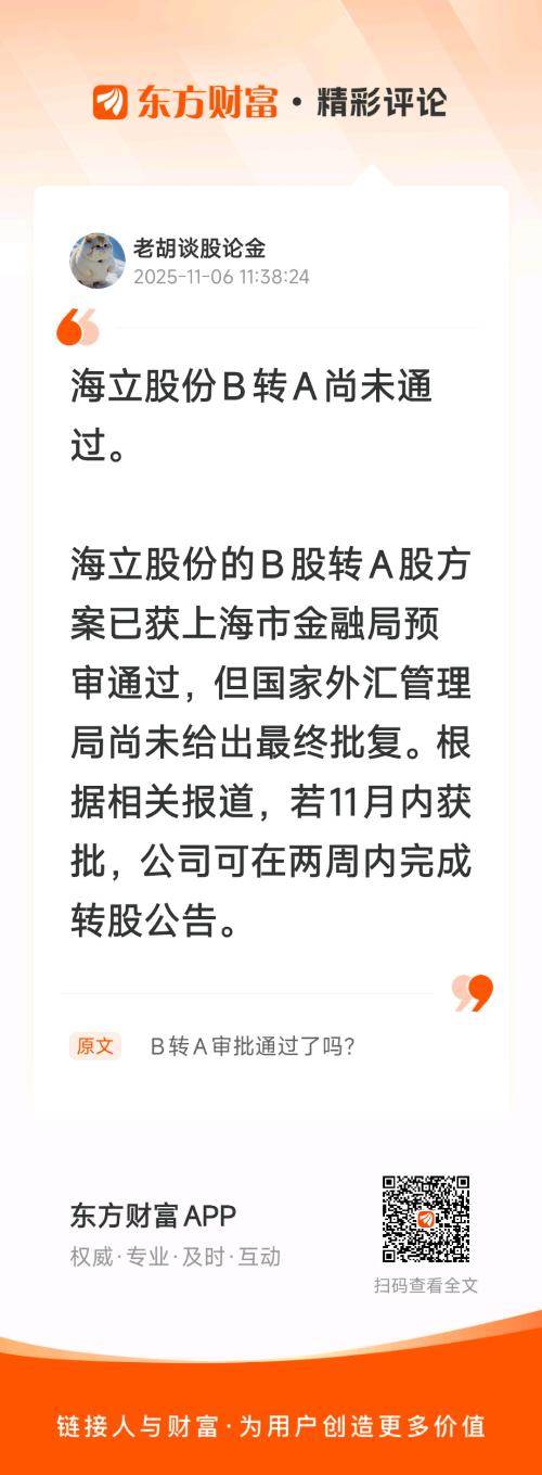 //@老胡谈股论金 :海立股份B转A尚未通过。 海立股份的B股转A股方案已获上海市金融局预审通过,但国家外汇管理局尚未给出最终批复。根据相关报道,若11月内获批,公司可在两周内完成转股公告。