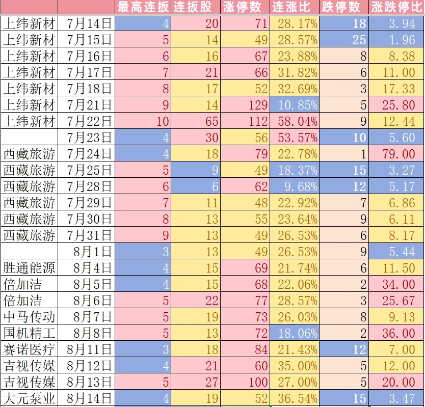 根据跌停突增、涨跌停比异常变小可以判断7月14日、7月23日、8月1日和今天8月14日是退潮日。也分别对应高位连板的断板日:上纬新材、西藏旅游、长城军工。
