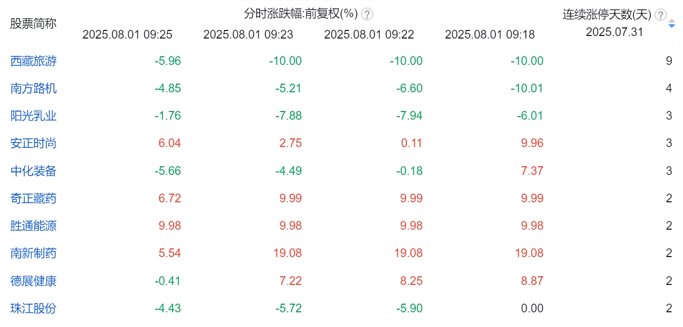 8月1日最高位9连板的西藏旅游和4连板的南方路机以跌停价进入9:18分的竞价初始阶段。