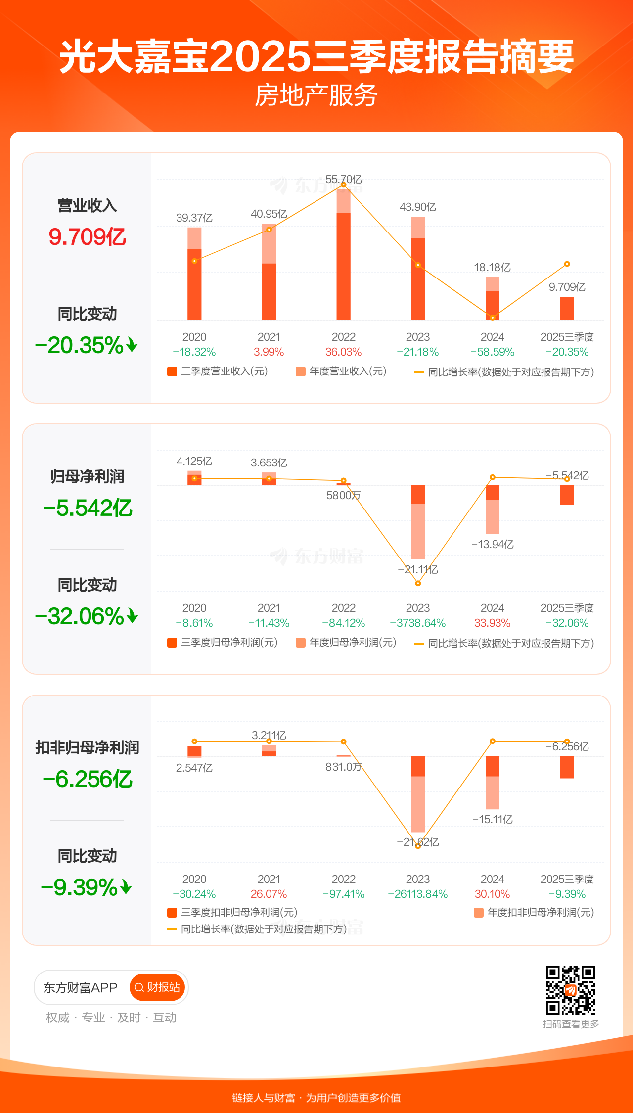 光大嘉宝10月31日发布2025年三季报显示,公司前三季实现营业收入9.71亿元,同比下滑20.35%;归母净利润-5.54亿元;扣非归母净利润-6.26亿元。