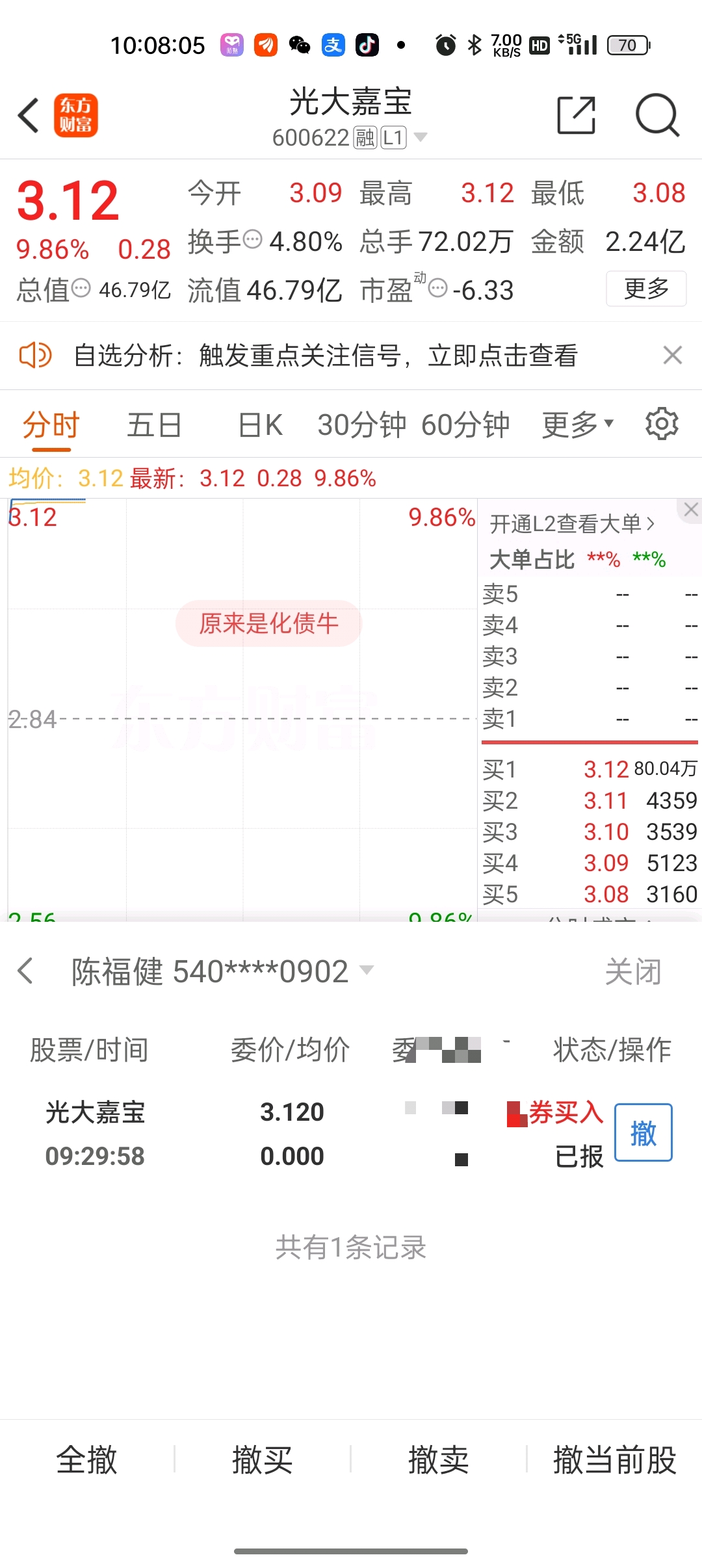 $光大嘉宝(SH600622)$ 为什么我的单子进不去,9.30前