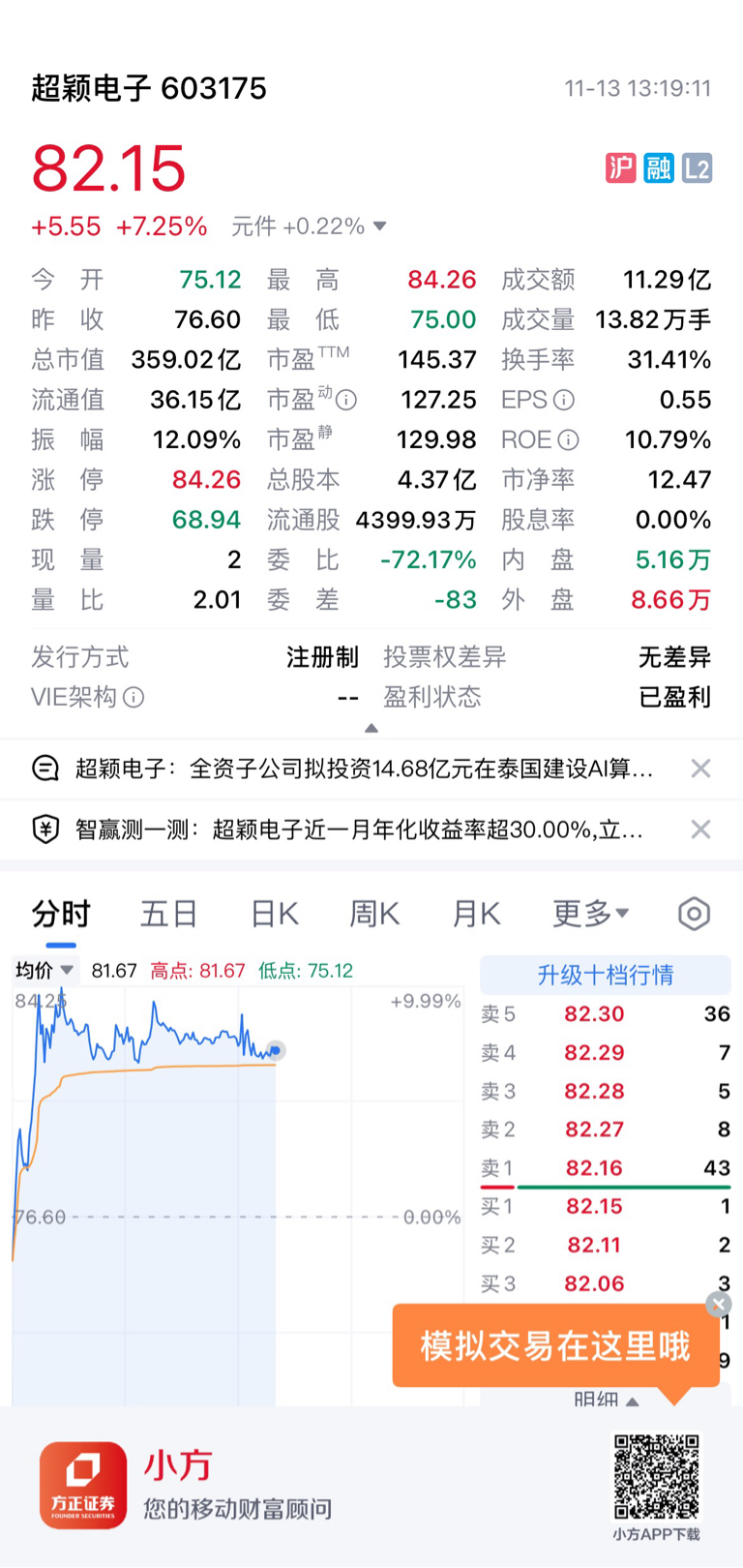 卖出超颖电子,持股三天,盈利11%,还可以。卖点不太好。半仓参与光大嘉宝
