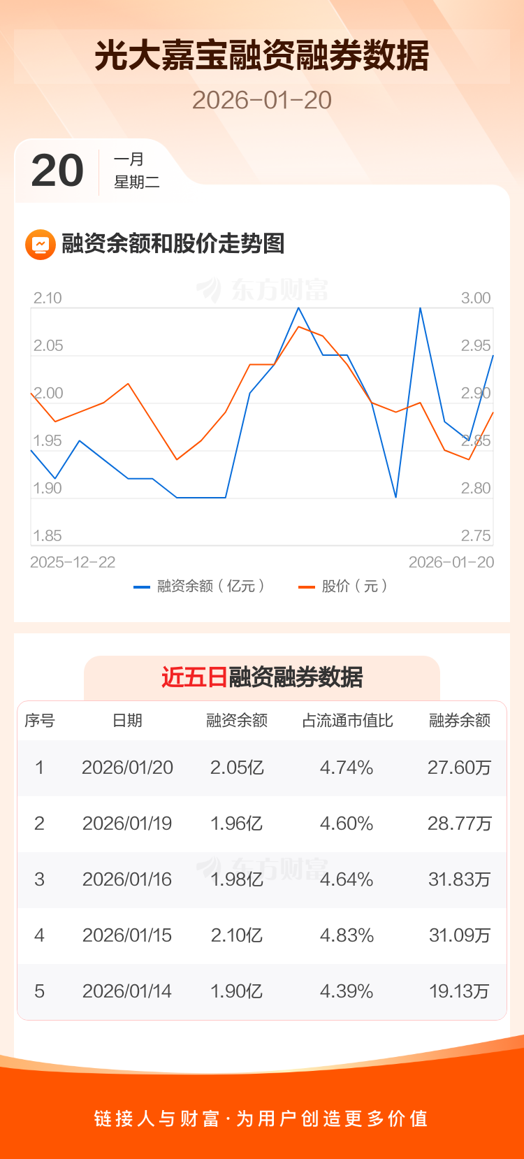交易所最新数据显示,光大嘉宝于2026年1月20日获融资买入2537.08万元,融资偿还1581.56万元,当日融资净买入955.52万元。目前,该股融资余额2.05亿,占流通市值比例为4.74%。