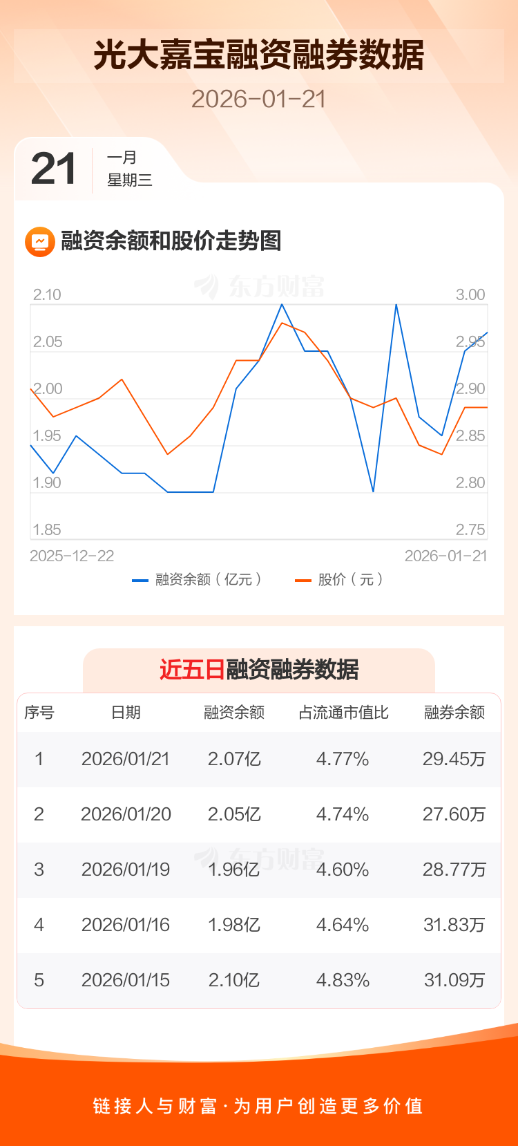 交易所最新数据显示,光大嘉宝于2026年1月21日获融资买入1549.63万元,融资偿还1404.80万元,当日融资净买入144.83万元。目前,该股融资余额2.07亿,占流通市值比例为4.77%。