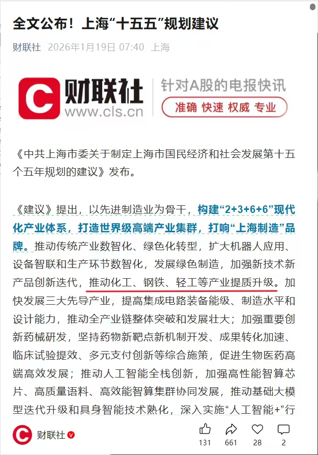 $华谊集团(SH600623)$ 上海市“十五五”规划建议发布,化工产业提质升级摆在显要位置