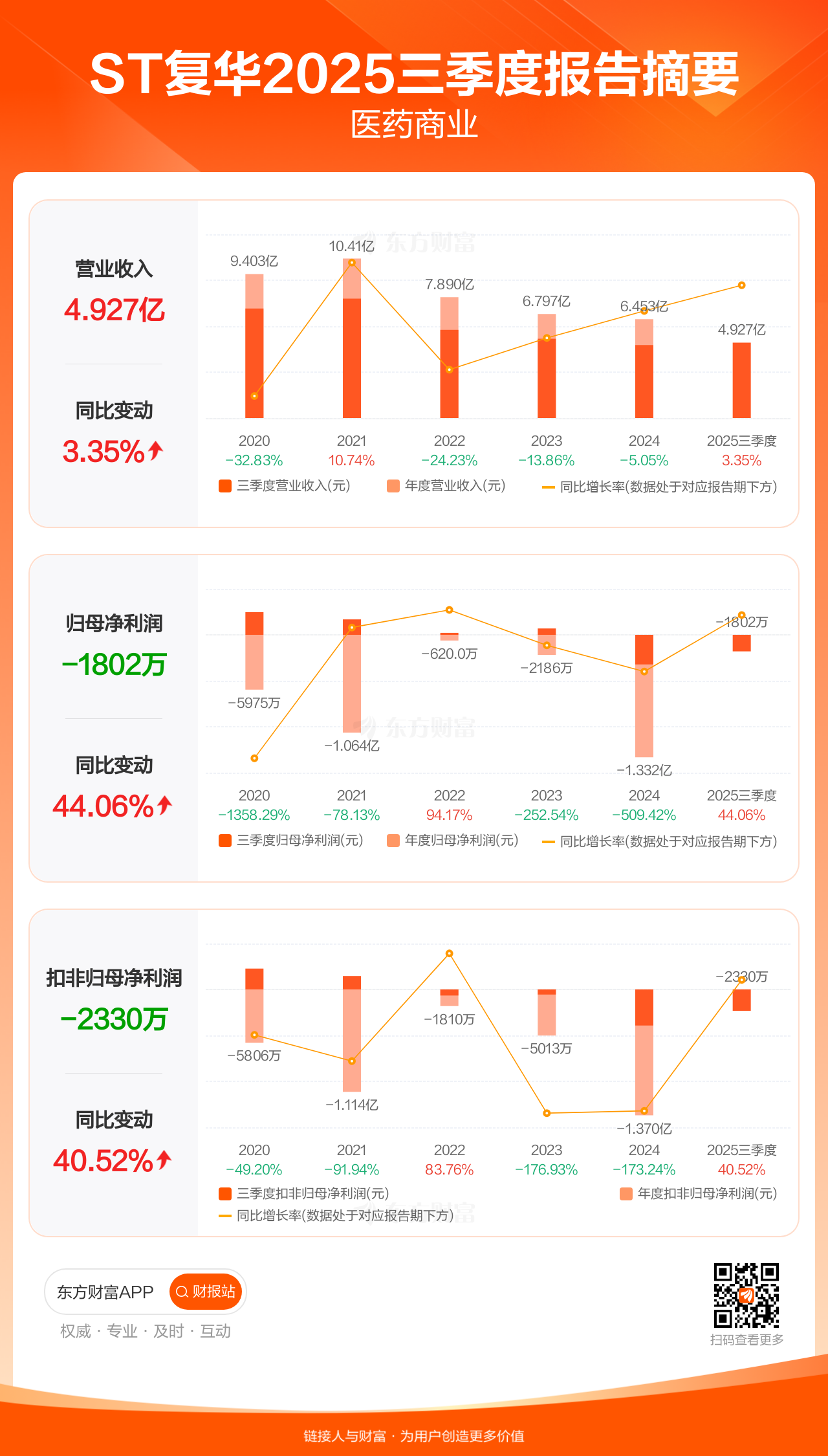 ST复华10月31日发布2025年三季报显示,公司前三季实现营业收入4.93亿元,同比增长3.35%;归母净利润-1801.65万元;扣非归母净利润-2330.19万元。
