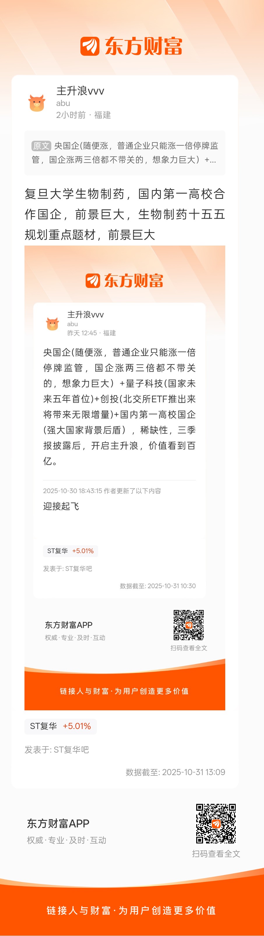 生物制药牛逼,国家战略级题材,怎么炒都有你,天空才是极限//@主升浪vvv :复旦大学生物制药,国内第一高校合作国企,前景巨大,生物制药十五五规划重点题材,前景巨大