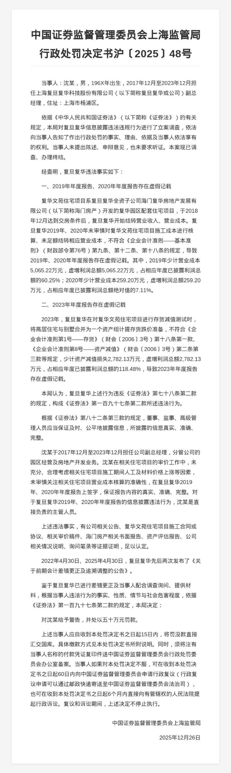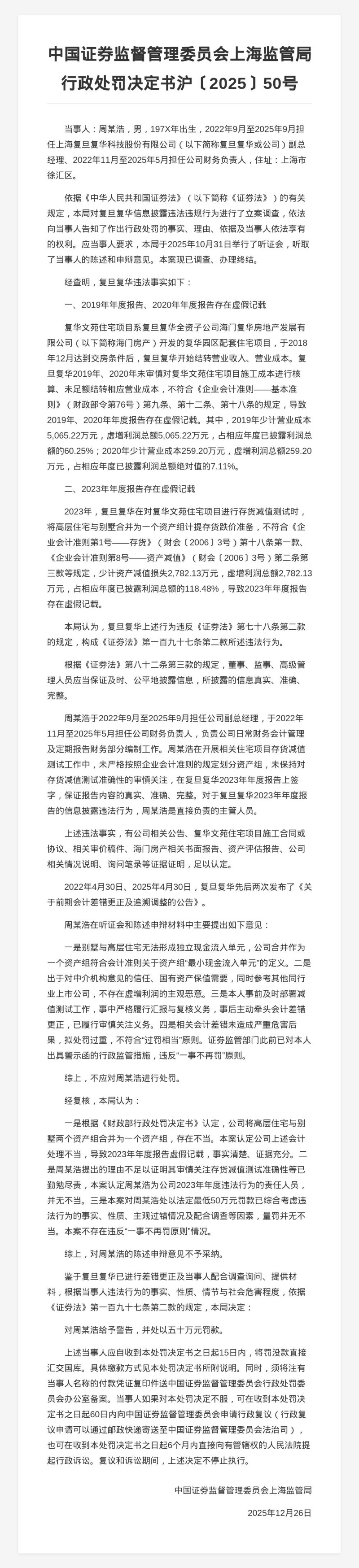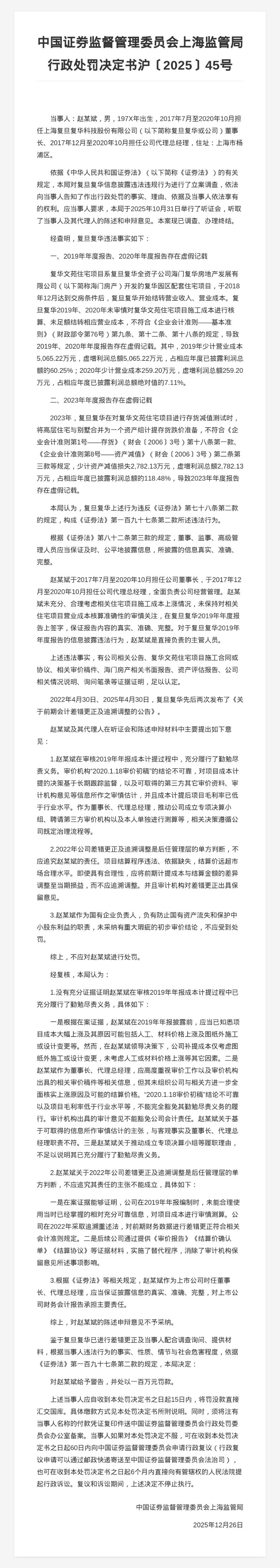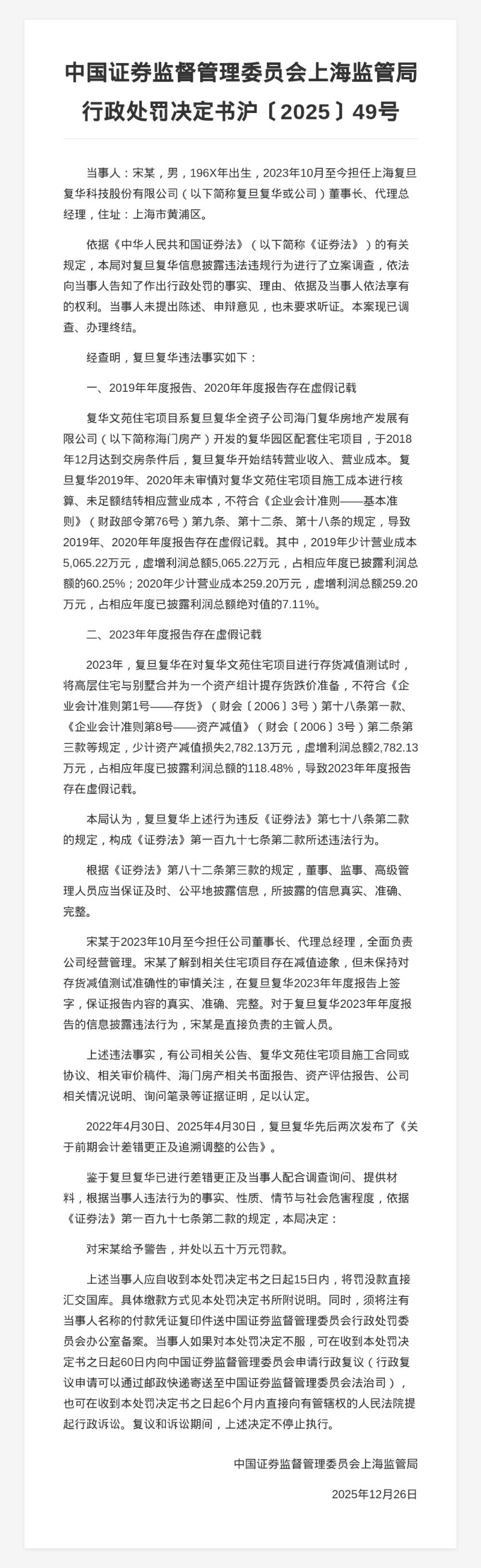 复旦复华科技被罚400万,责任人共被罚370万,涉年报虚假记载