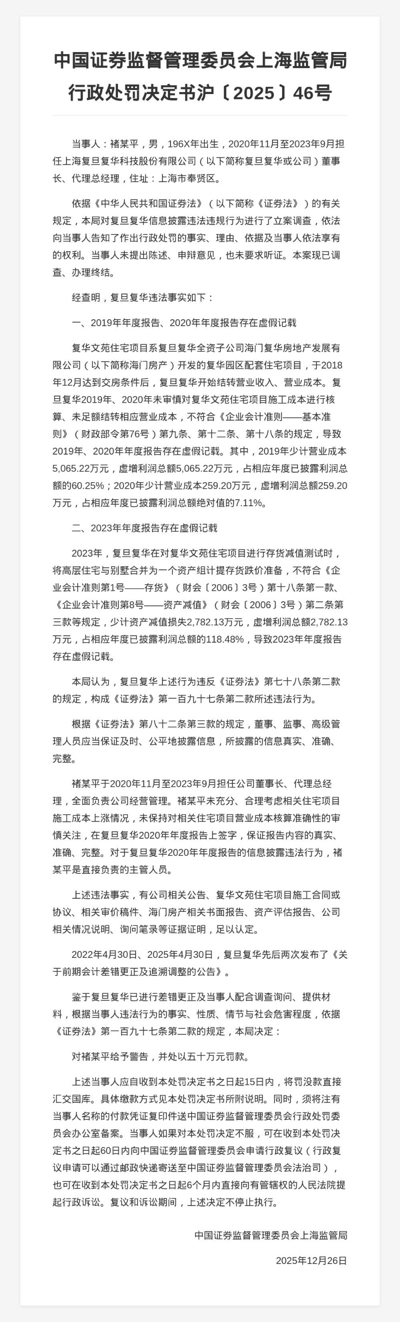 蓝鲸新闻1月20日讯,近日,中国证券监督管理委员会上海监管局发布行政处罚决定书,剑指上海复旦复华科技股份有限公司及相关责任人。