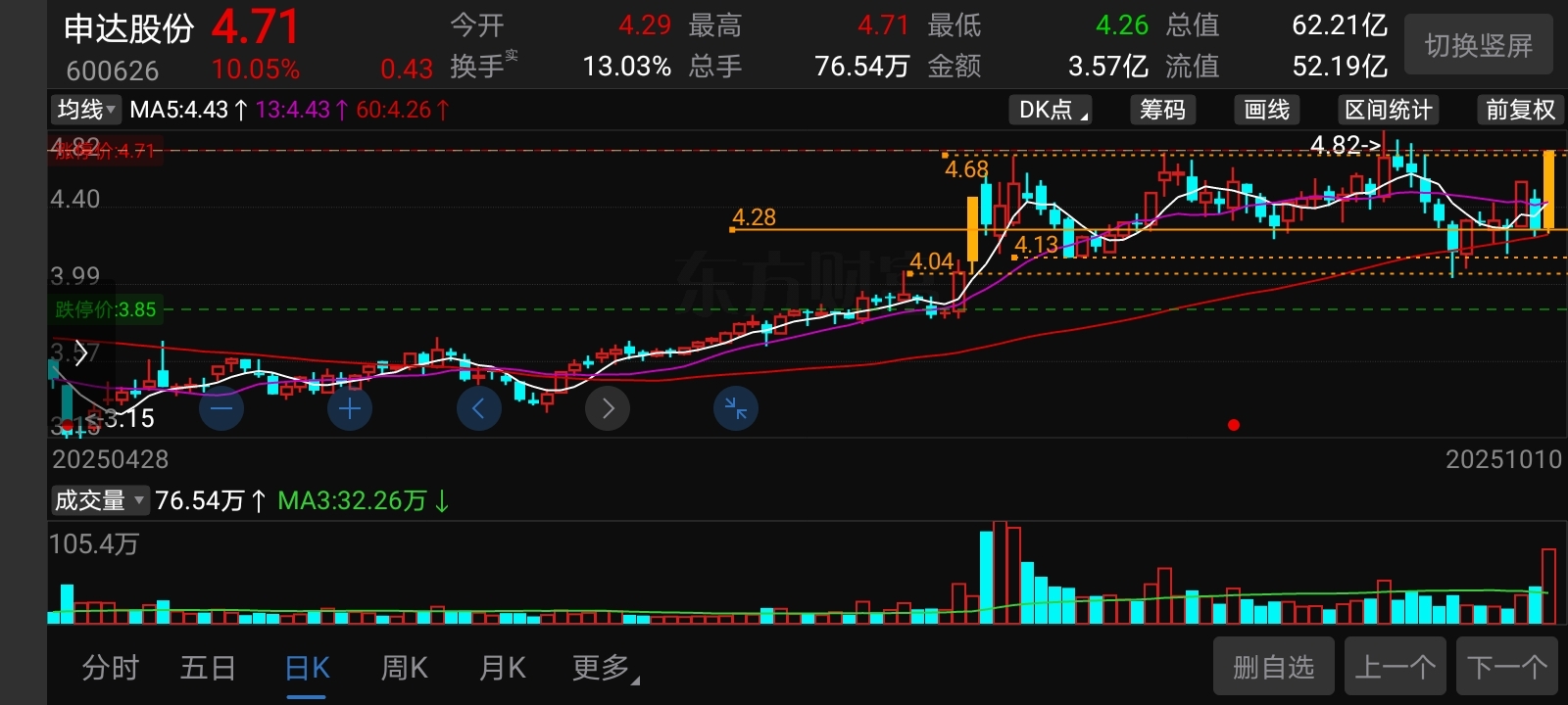$申达股份(SH600626)$ 1、最低收盘不破涨停底2、涨停横盘区间W底,收盘价底在抬高3、收盘价创193日新高,4、倍量过左峰,涨停急先锋5、筹码很集中6、60均线回踩小破到回踩不破