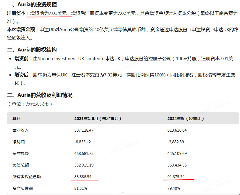 申达股份增资的这公司Auria,之前亏了不少啊,7.01亿美元的资本金,还剩8.66亿人民币了,这都快亏没了,所以要增资啊。