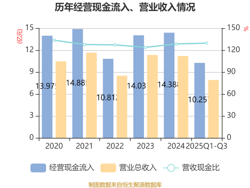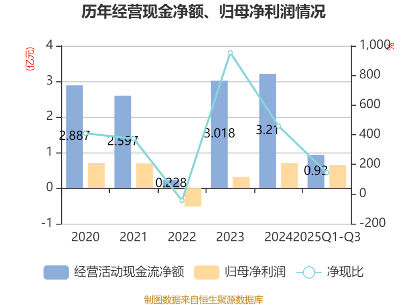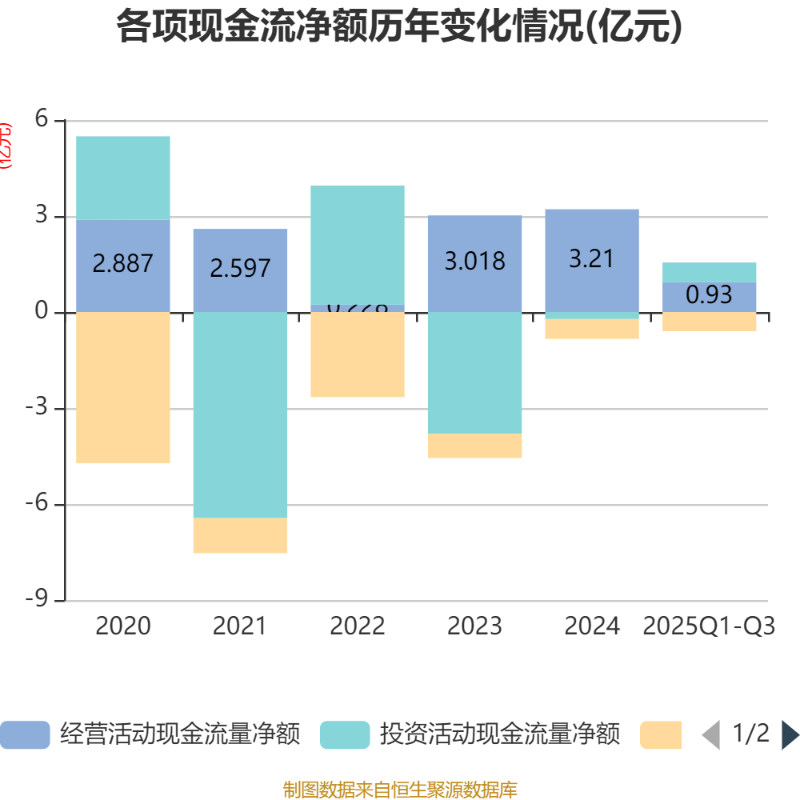 2025年前三季度,公司经营活动现金流净额为9297.78万元,同比下降19.79%;筹资活动现金流净额-5985.59万元,同比减少2156.91万元;投资活动现金流净额6169.76万元,上年同期为2.43亿元。