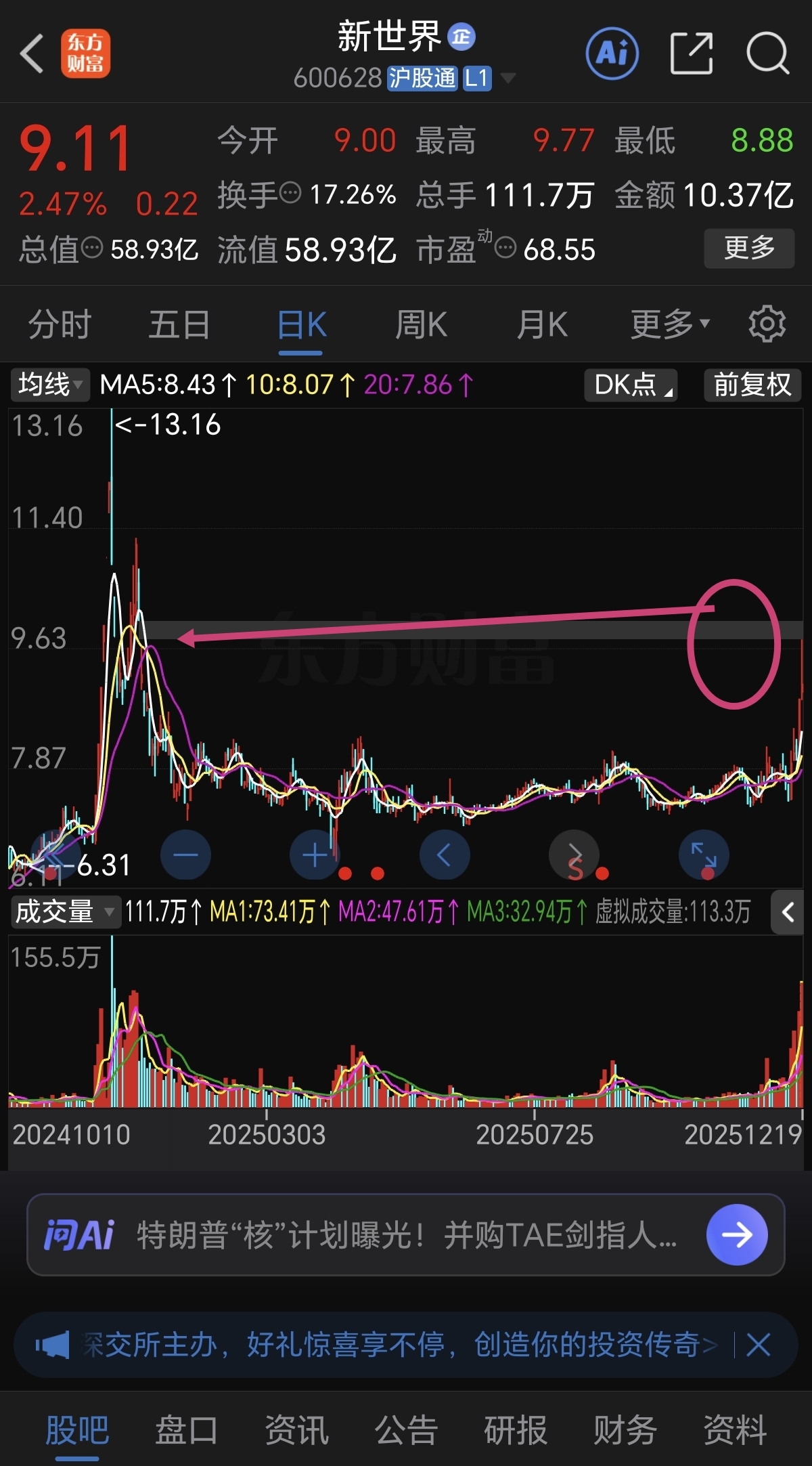 $新世界(SH600628)$ 追高的不知道怎么想的,这么大一个缺口看不到?有缺口就有压力