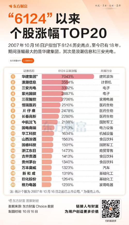 2007年10月16日沪指创下6124历史高点,至今已有18年。以下图表是612