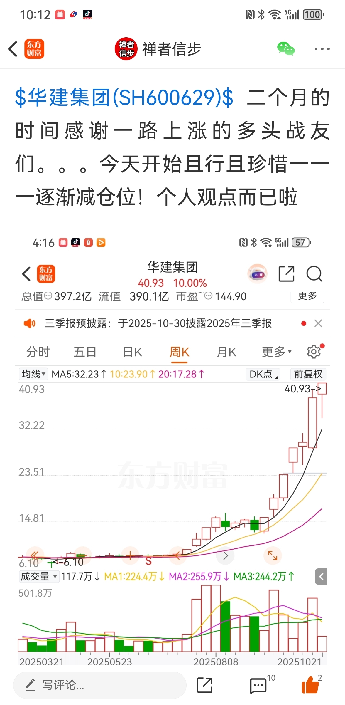$华建集团(SH600629)$ 二个月的时间感谢一路上涨的多头战友们。。。今天开始且行且珍惜一一一逐渐减仓位吧!个人观点而已啦