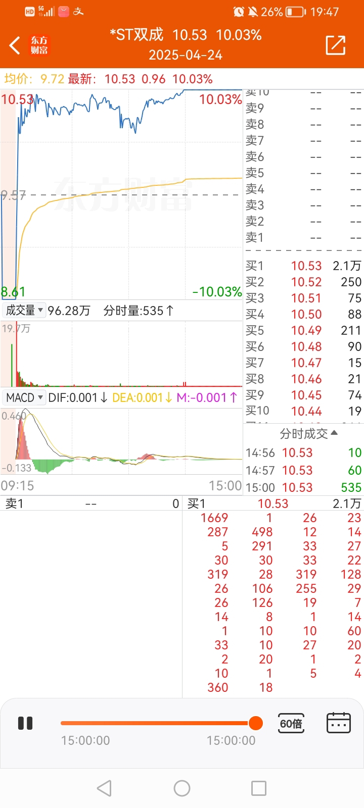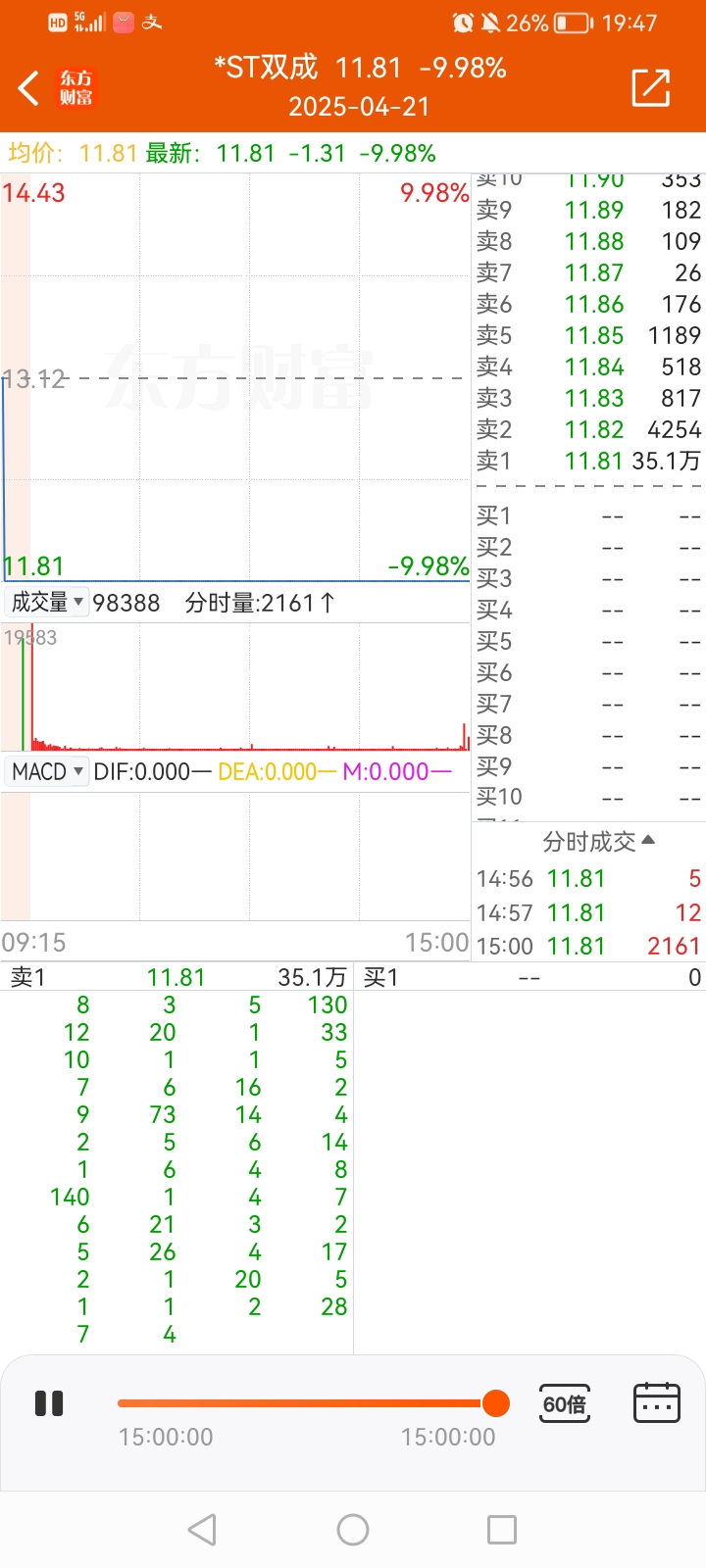 $华建集团(SH600629)$ $*ST双成(SZ002693)$ 双城药业重组失败,三个一字跌停,在第四个跌停板成功地天板!走势可以参考一下!周一跌停就买入,但是集合竞价撬板就不买了,上次被际华集团集合竞价撬板骗惨了