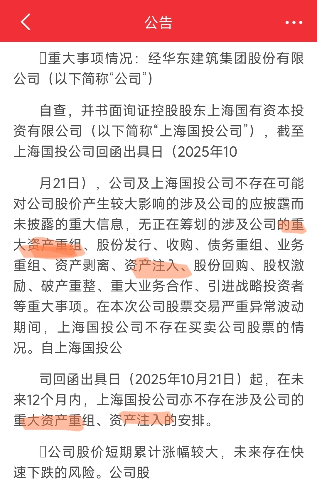$华建集团(SH600629)$ 重新审视这公告,按照这个表达口径,12个月内并没有排除公司可以进行股份发行、收购、债务重组、业务重组、资产剥离、股份回购、股权激励、破产重整、重大业务合作、引进战略投资者等重大事项。除非写的是,12个月内不涉及公司的重大事项的安排,那话就说死了。大家评评理,是我在自我麻痹么?