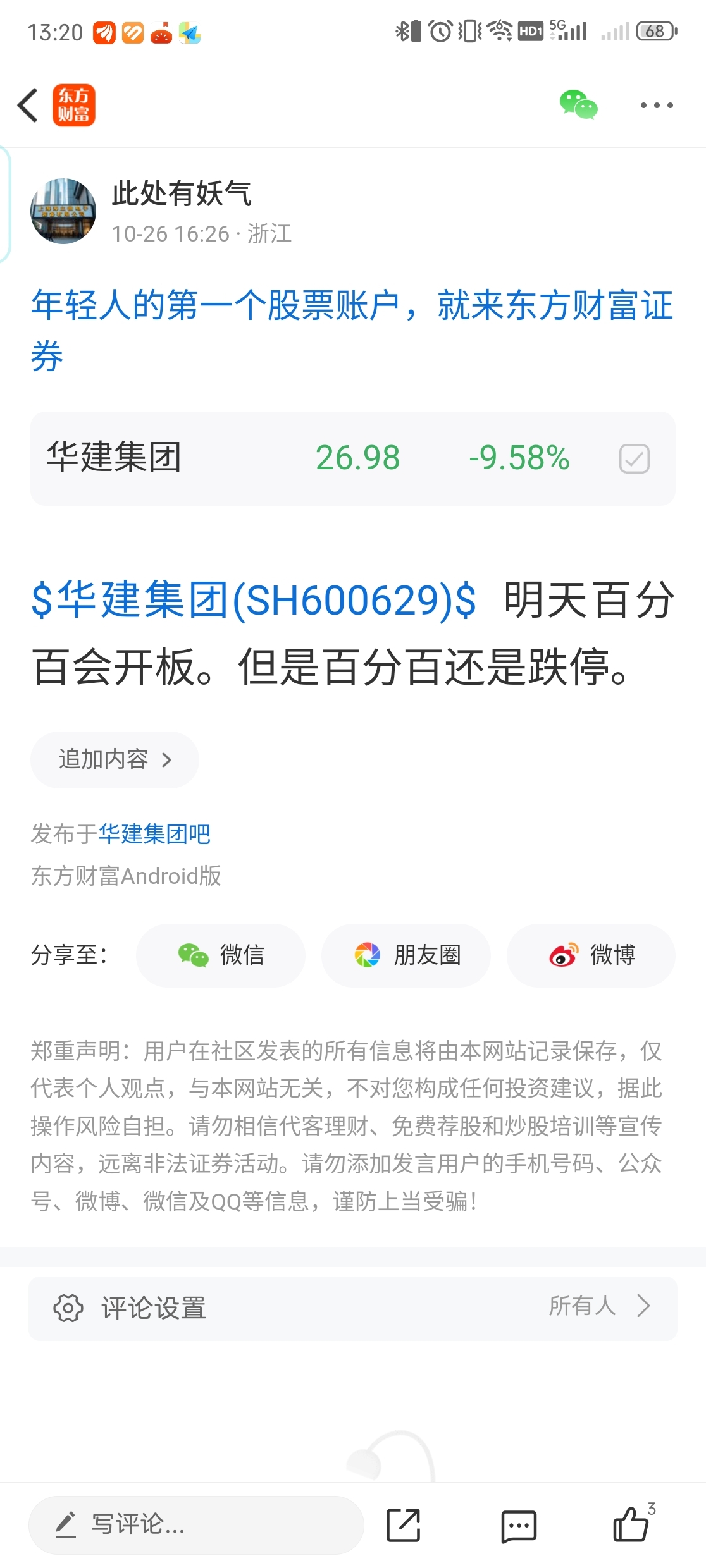 昨天我就说星期一华建百分百开板。收盘百分百跌停。