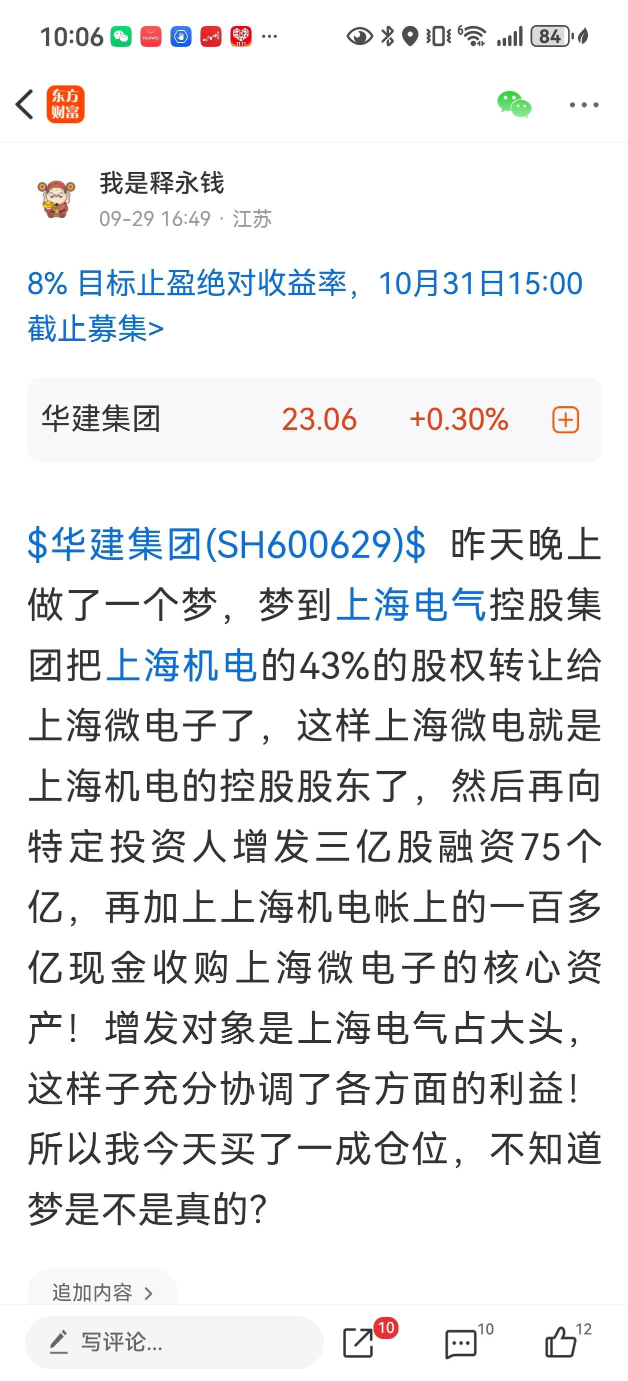 9月底我就预测了上海机电是真正的借壳对象,怕你们喷水,所以借口是梦到的,这样说有