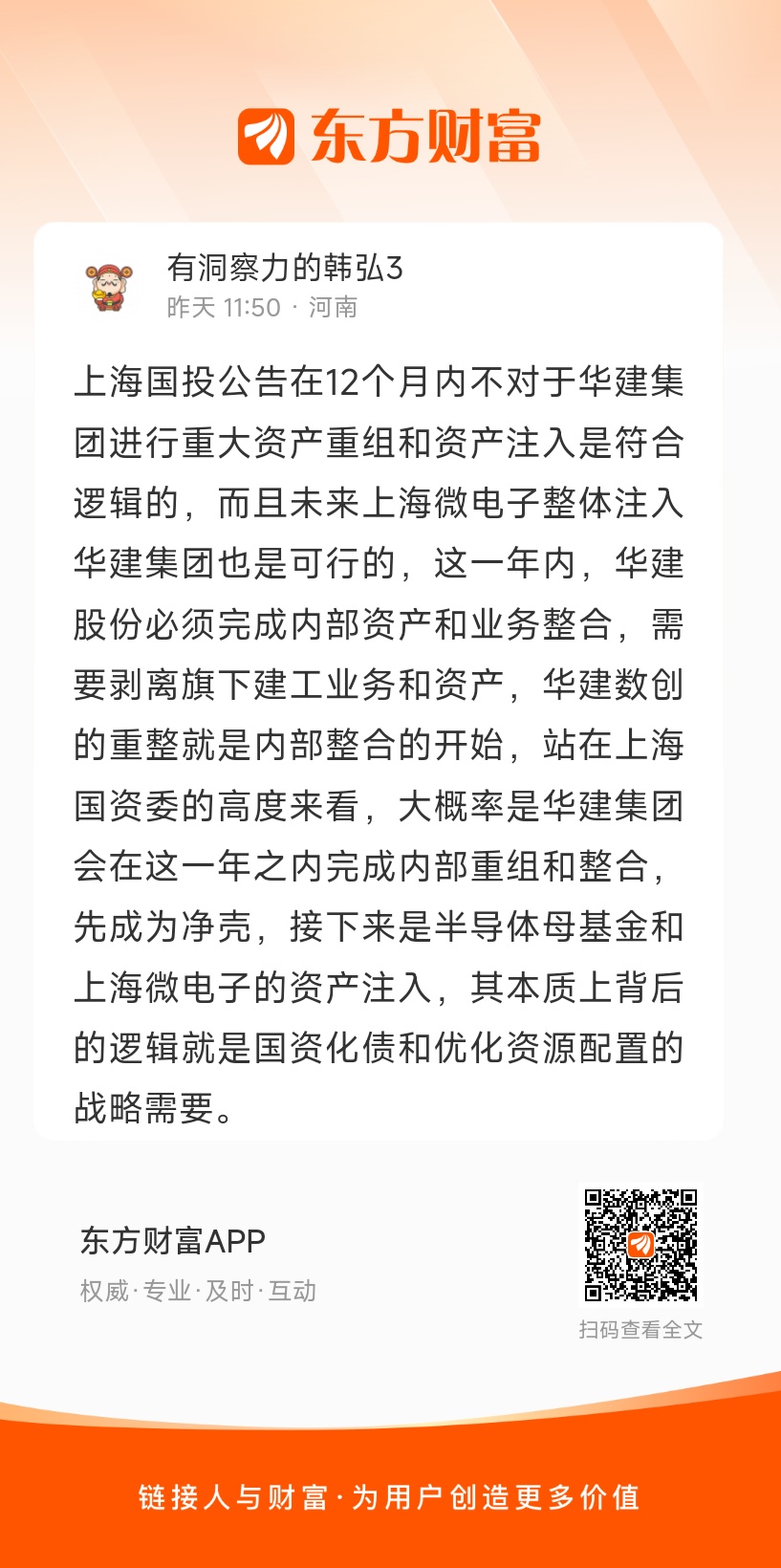 上海国投公告在12个月内不对于华建集团进行重大资产重组和资产注入是符合逻辑的,而且未来上海微电子整体注入华建集团也是可行的,这一年内,华建股份必须完成内部资产和业务整合,需要剥离旗下建工业务和资产,华建数创的重整就是内部整合的开始,站在上海国资委的高度来看,大概率是华建集团会在这一年之内完成内部重组和整合,先成为净壳,接下来是半导体母基金和上海微电子的资产注入,其本质上背后的逻辑就是国资化债和优化资源配置的战略需要。