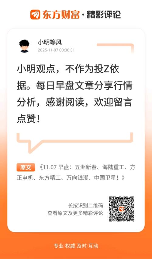 五洲新春:从目前的个股走势来看,昨天早盘一度出现了高开,随后大幅回落,迅速拉升,两次触及涨停板的走势,这一个很明显就是属于消息面驱动下的上涨,而且这个涨停板非常的具有不确定性,而且有洗盘的意味。个股大概率是还能够走一波上升趋势性的行情。从消息面的刺激上来看,则是在前天小鹏发布了最新的一代机器人以后,在市场上面掀起了热烈的讨论,到底是真人还是机器人,最终在昨天的中午一镜到底的镜头之下得到了实质的验证,所以机器人获得了市场的认可。在此情况之中,相关的机器人概念也是。带来了相应的热度迎来了上涨,所以个股也是跟供应特斯拉一样,属于二级供应商。目前来讲走出了强势上升的这个行情,当前的技术形态来讲,很明显还会有继续上升的动能,所以在今天如果有回踩45或者是5天线的低位研究的可能性,那么就非常值得期待。$五洲新春(SH603667)$