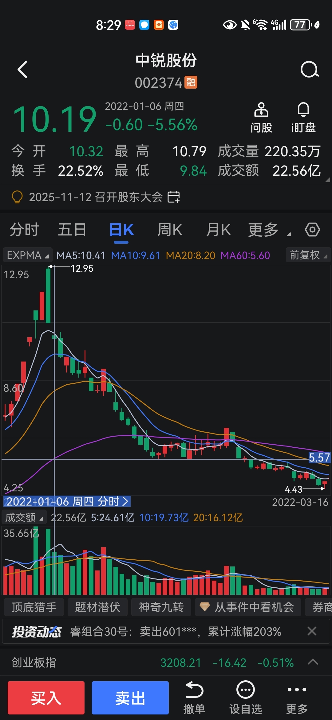 有人举出之前中锐股份的例子,那来研究看下,12块多跌到5.56,在5.56左右抄