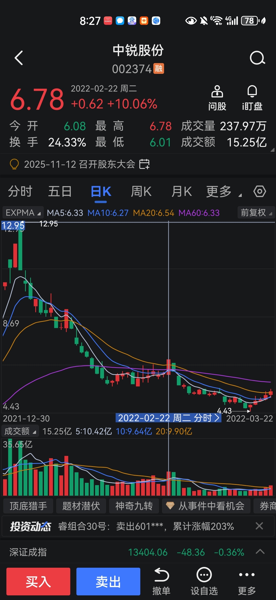 $华建集团(SH600629)$ 有人举出之前中锐股份的例子,那来研究看下,12块多跌到5.56,在5.56左右抄底的,后来有没有反弹到6.78,是不是又证明了有反弹,不会说到了5.56还一直不反弹跌下去,所以华建关注19.87到21.79的抄底机会,各位觉得有问题吗