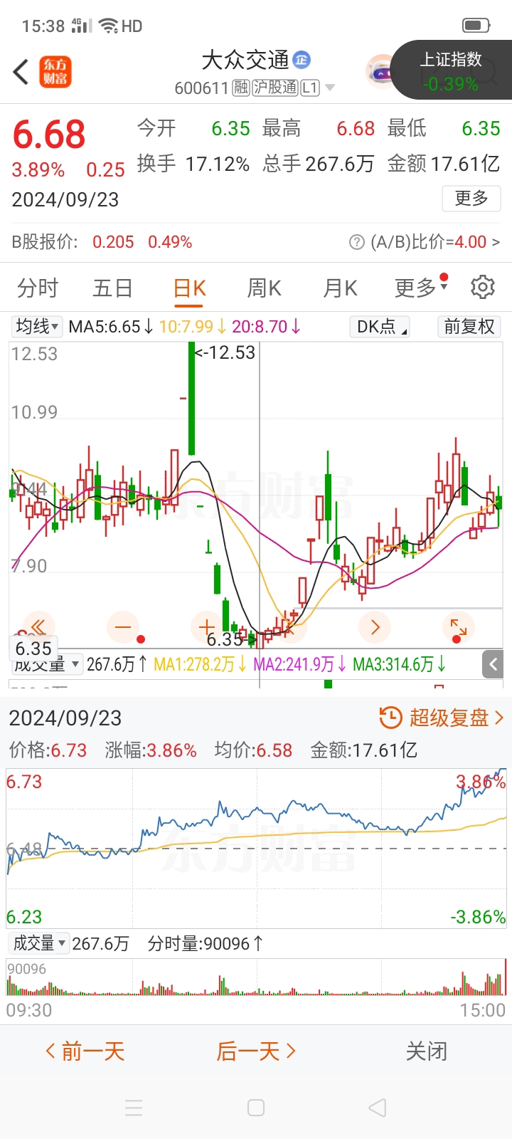 华建跌下来已第15天,跌了46.74%,一年前大众交通高点跌下来后,第14天出涨