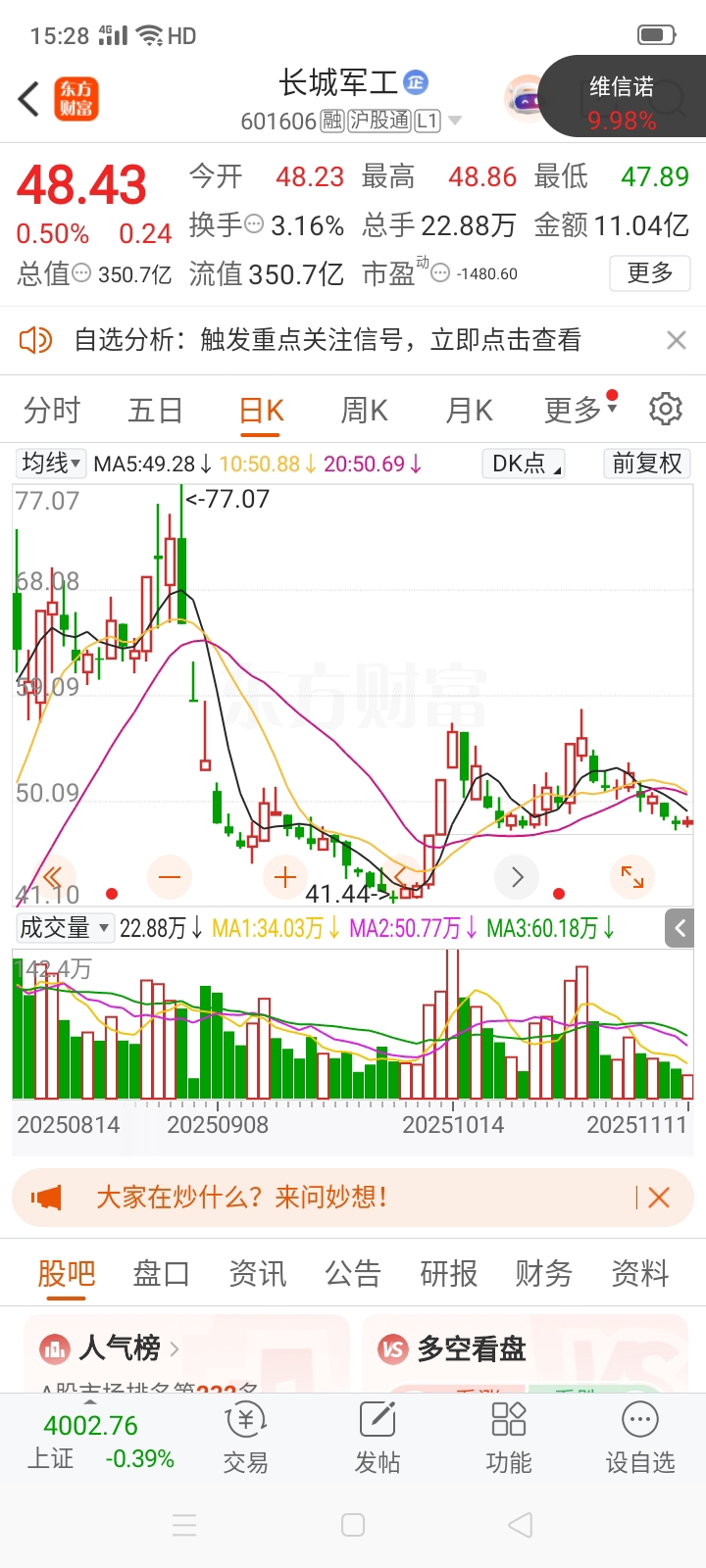 $华建集团(SH600629)$ 华建跌下来已第15天,跌了46.74%,一年前大众交通高点跌下来后,第14天出涨停,这期间最高跌了49.31%,长城军工高点跌下来后,第22天出涨停,最高跌了46.23%,我觉得华建最多还有一次6、7个点的急跌,就要反弹了。