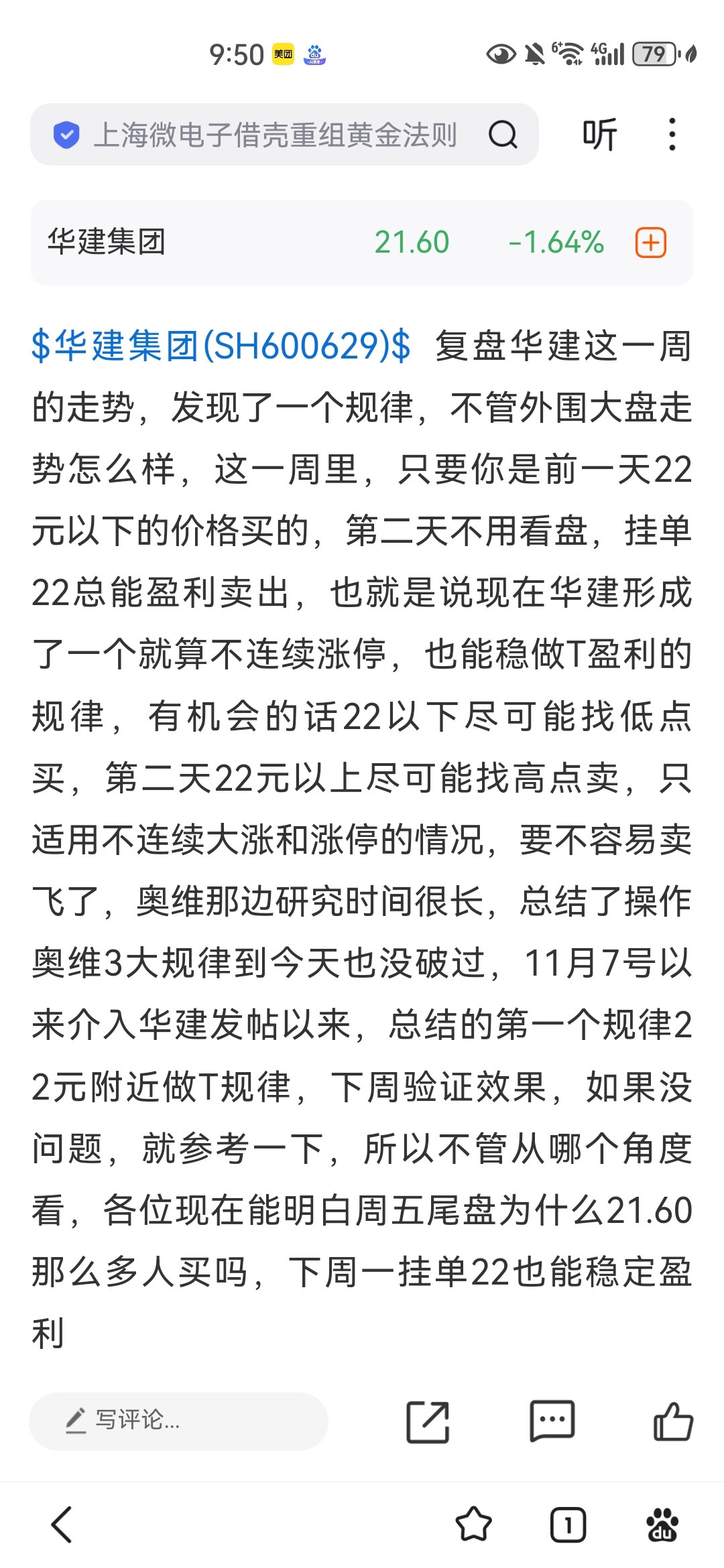 $华建集团(SH600629)$ 之前有人问华建要怎么弄,今天临时分享一个新发现的规律,不要管外围走势,单看华建,22元以下找低点买,22元以上找高点卖,连续大涨或者涨停锁仓不动,下周看这个规律验证效果,如果没问题的话,各位以后可以参考看看